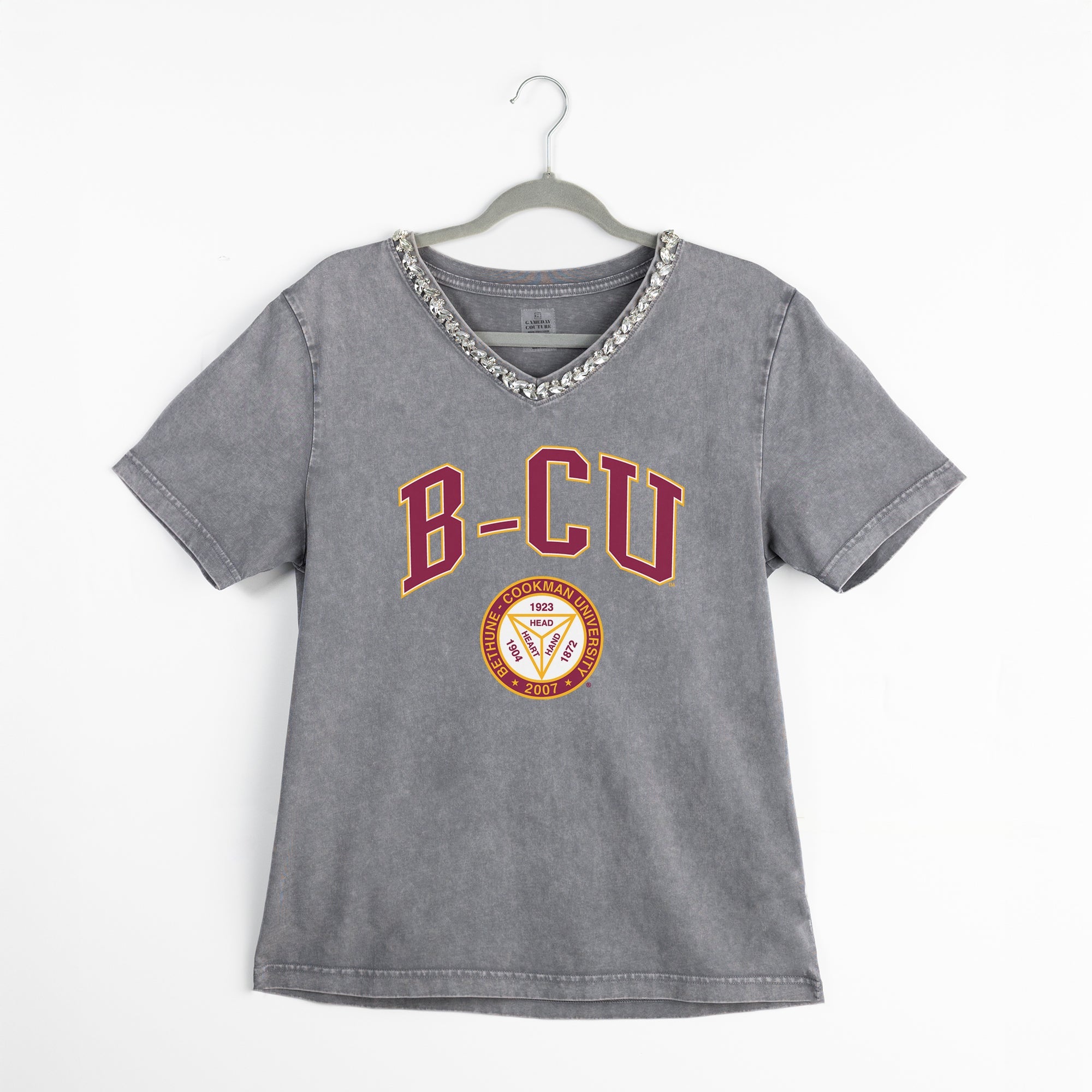 Turn your team spirit into a statement with this rhinestone-trimmed V-neck tee. Made from soft, washed fabric with a relaxed feminine fit, it adds just the right amount of sparkle to your gameday look. Whether you're headed to the tailgate or layering it under a jacket, this tee is bold, easy, and made to shine for Bethune-Cookman Wildcats.