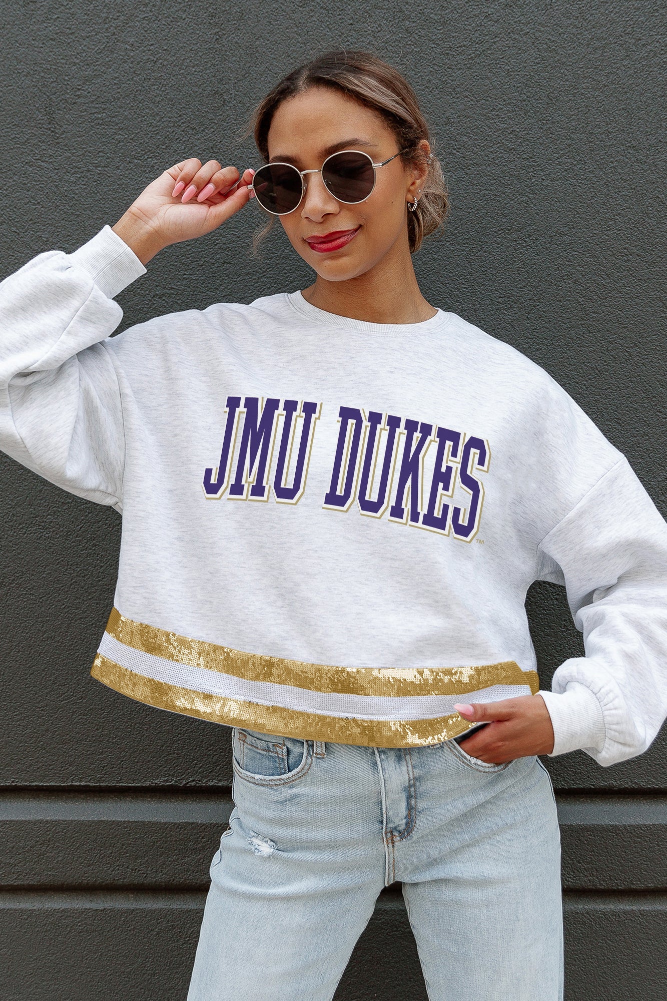 Sport your James Madison Dukes spirit with our chic long sleeve cropped metallic shimmer-stripe top. Boasting a moderate length and adorned with sequin stripes on the hem, it's the ideal choice for fashion-forward fans.