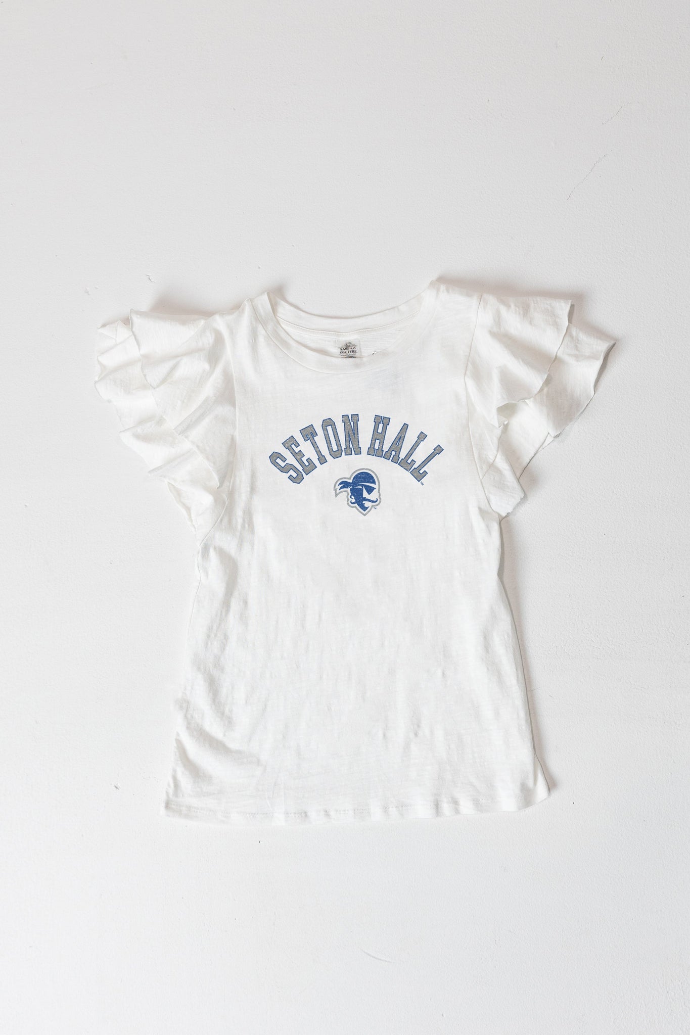 Feel the excitement of game day with our Seton Hall Pirates flutter sleeve crewneck top. This short sleeve ruffle sleeve slub knit top is a versatile addition to any wardrobe. Perfect for fans who want to look good and feel great.