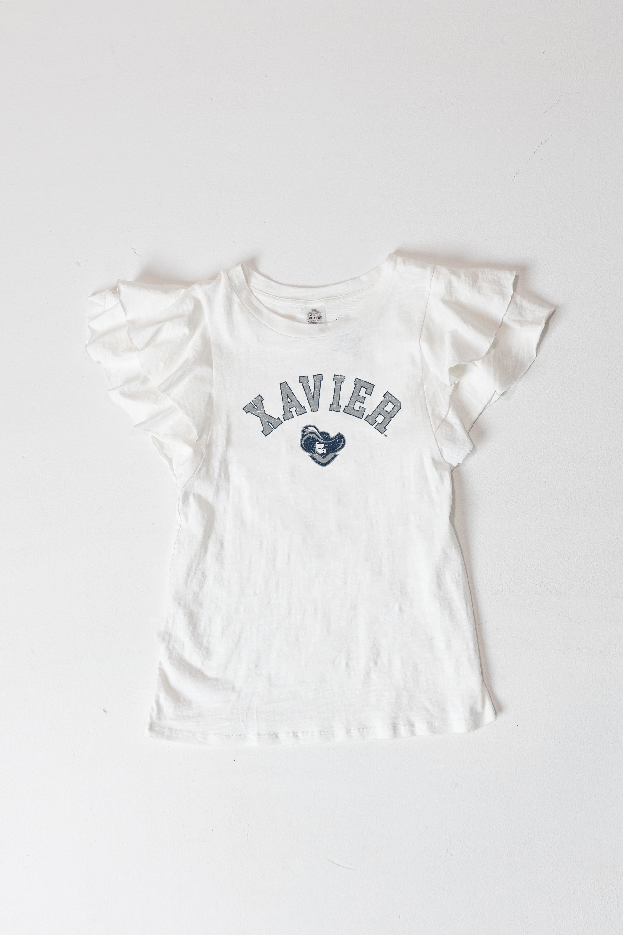 Feel the excitement of game day with our Xavier Musketeers flutter sleeve crewneck top. This short sleeve ruffle sleeve slub knit top is a versatile addition to any wardrobe. Perfect for fans who want to look good and feel great.