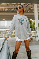 This cool and sporty vintage wash pullover will be the trendiest team inspired style of the season! Featuring a casual and chic mineral wash fabric, long cuffed sleeves and an oversized fit.