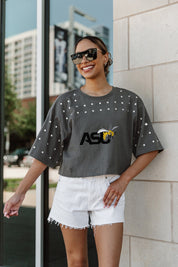Shine with pride in our Alabama State Hornets all-over rhinestone cropped tee with yoke. Whether you're cheering from the stands or hitting the town, embrace effortless style and comfort while standing out from the crowd.