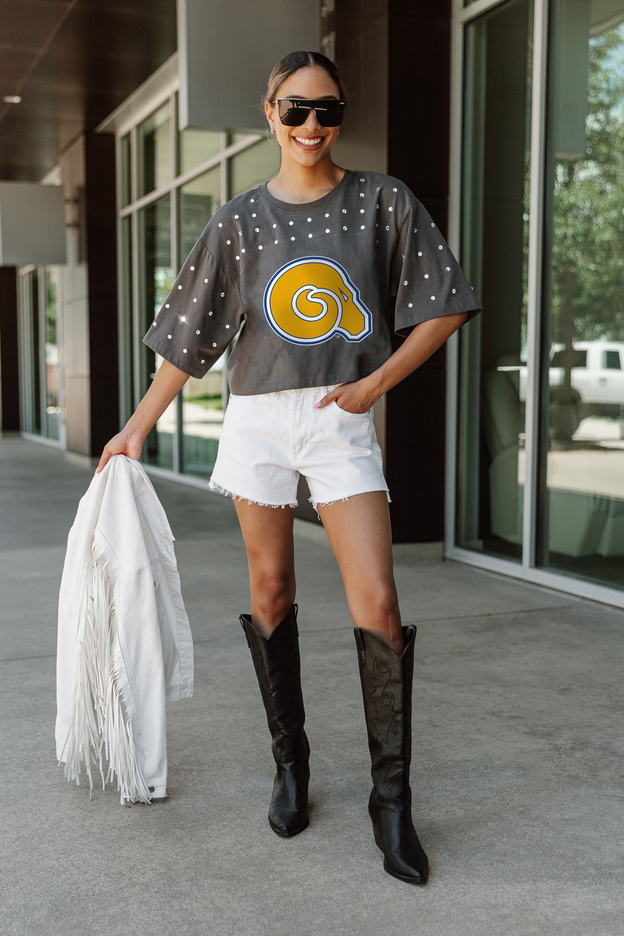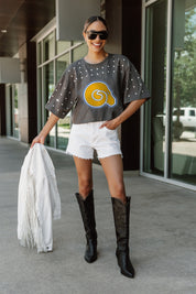 Shine with pride in our Albany State Golden Rams all-over rhinestone cropped tee with yoke. Whether you're cheering from the stands or hitting the town, embrace effortless style and comfort while standing out from the crowd.