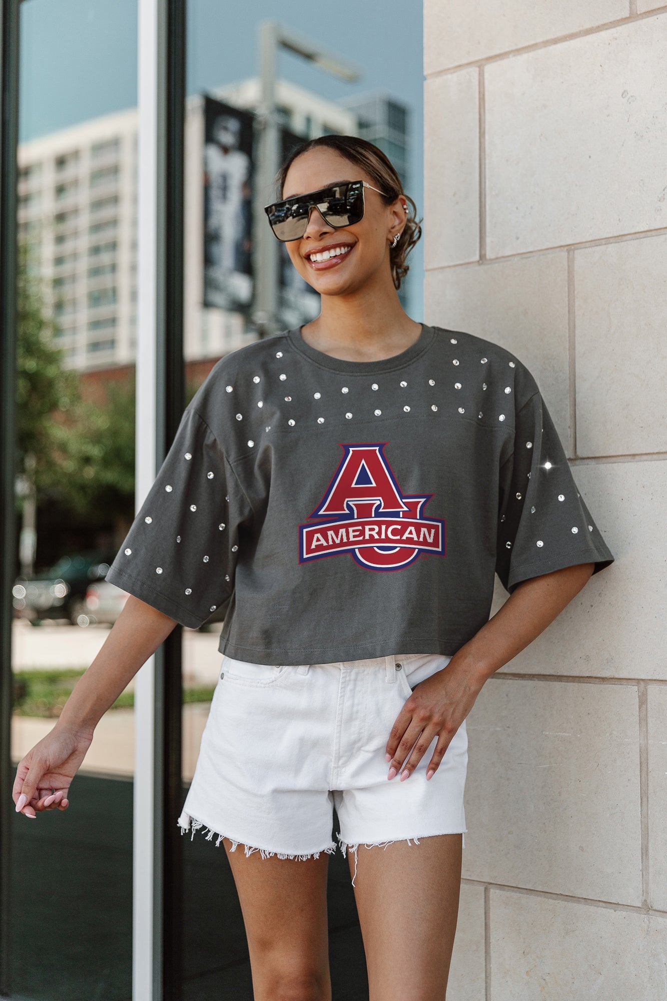 AMERICAN UNIVERSITY EAGLES MAKING MOVES ALL-OVER RHINESTONE CROPPED TEE WITH YOKE