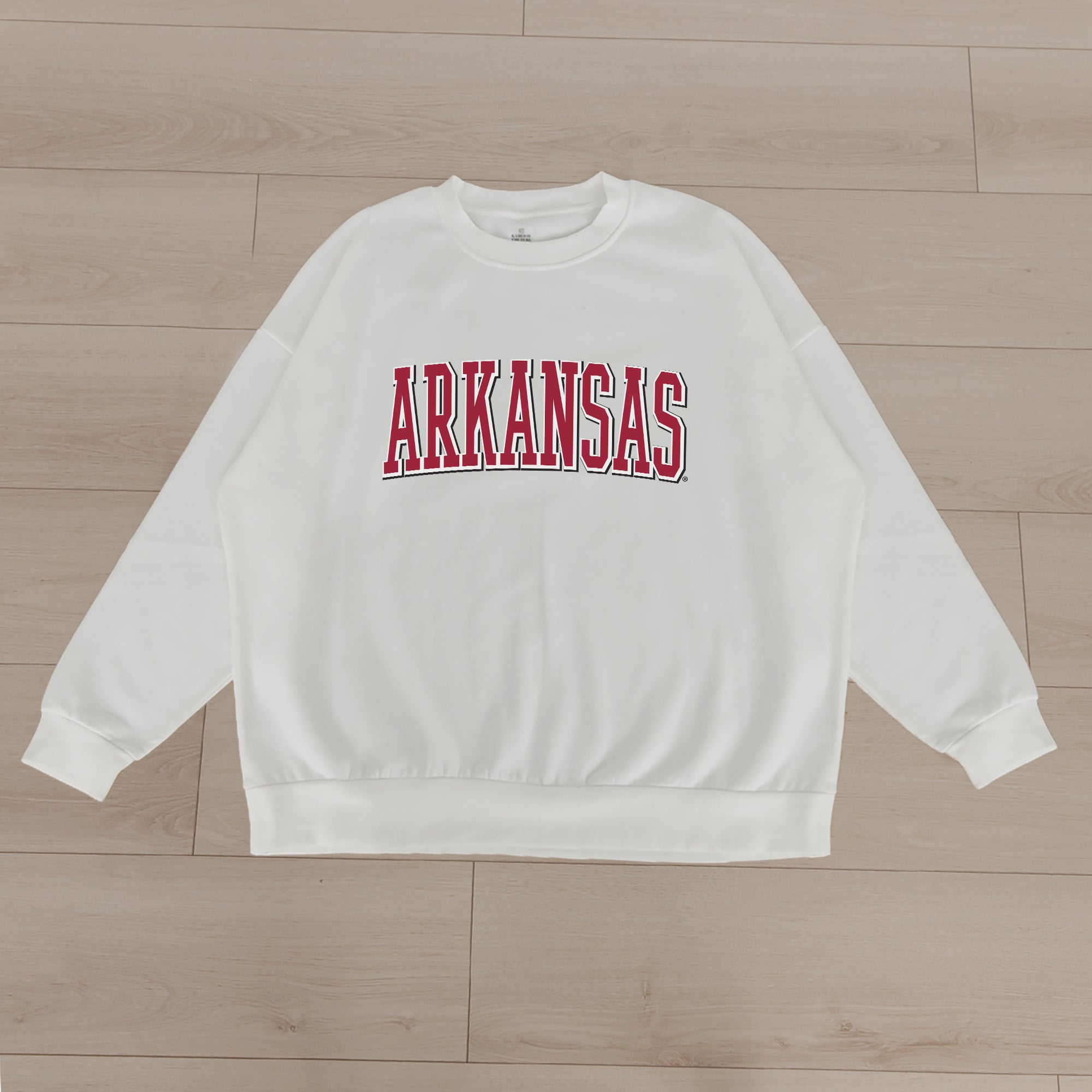 Stand out from the crowd in our Arkansas Razorbacks premium fleece long sleeve sweatshirt. Boasting an oversized fit, crewneck and ribbed knit neckline, wrists, and waistband, it effortlessly blends comfort with fashion. Show your support for your favorite school or team in this irresistibly soft sweatshirt.