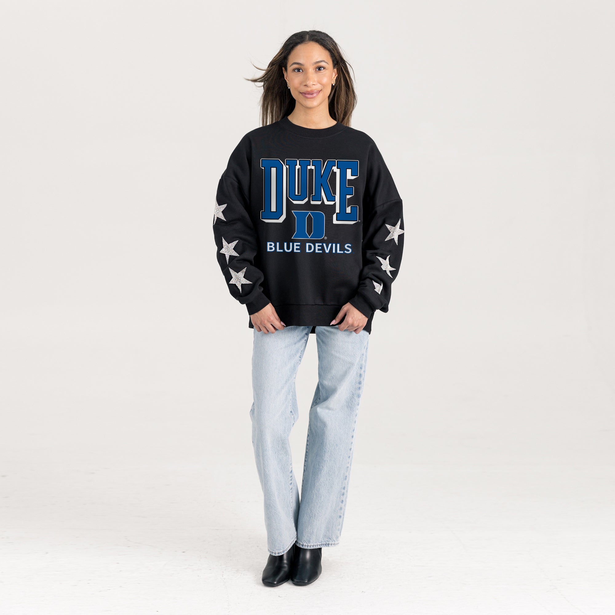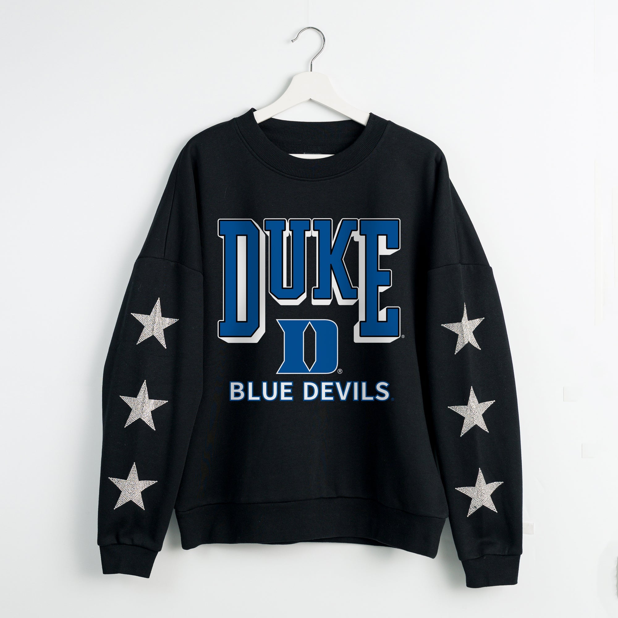 Elevate gameday with our Duke Blue Devils drop shoulder, long sleeve fleece pullover adorned with rhinestud stars on the sleeves. Shine brightly and show your Duke Blue Devils pride.