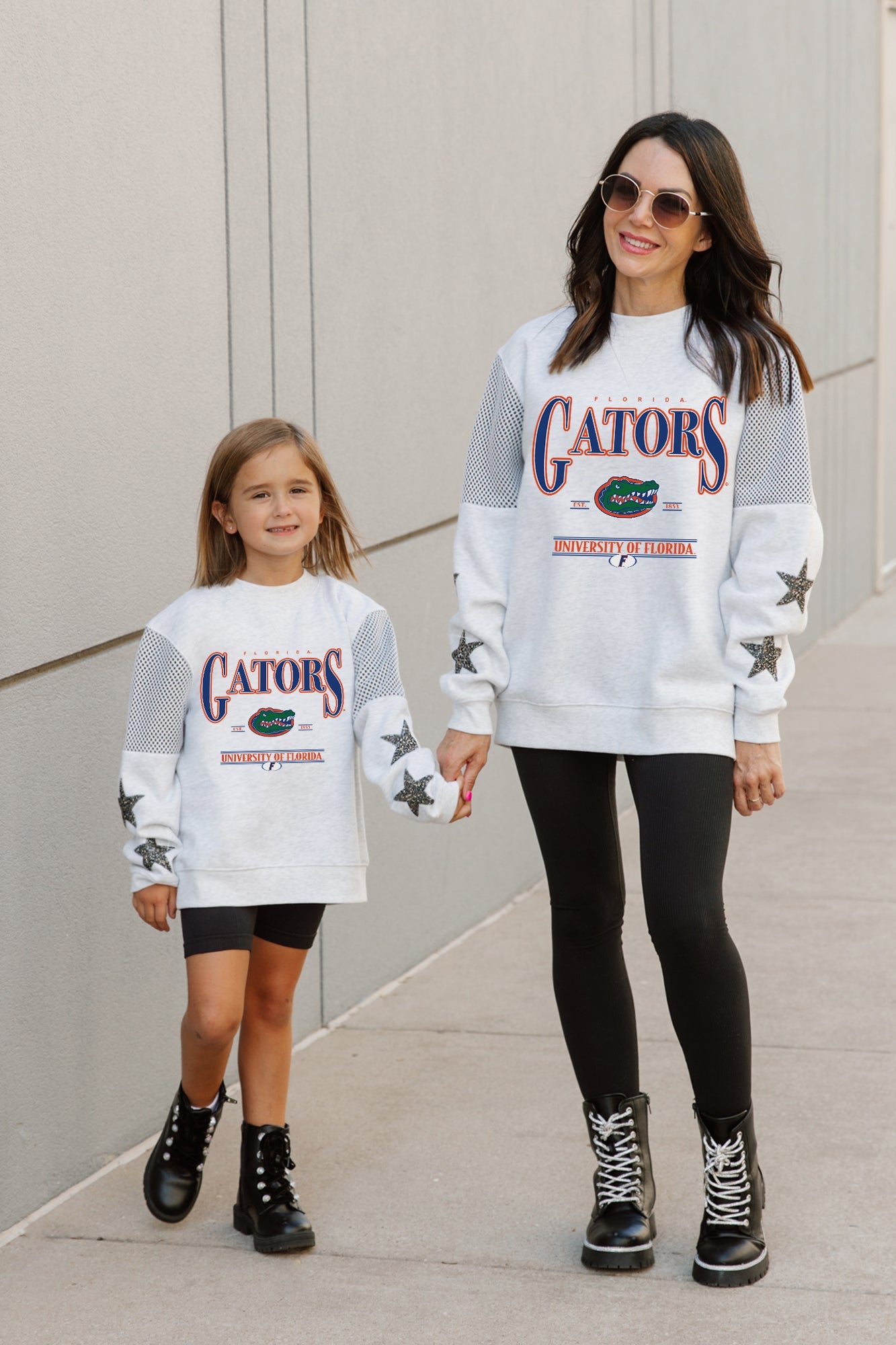 Make a bold statement with our Florida Gators long sleeve crewneck fleece, designed to turn heads effortlessly. Featuring contrasting jersey mesh upper arm inserts and dazzling rhinestud stars on the sleeves, this fashionably unique piece ensures you stand out in any crowd.