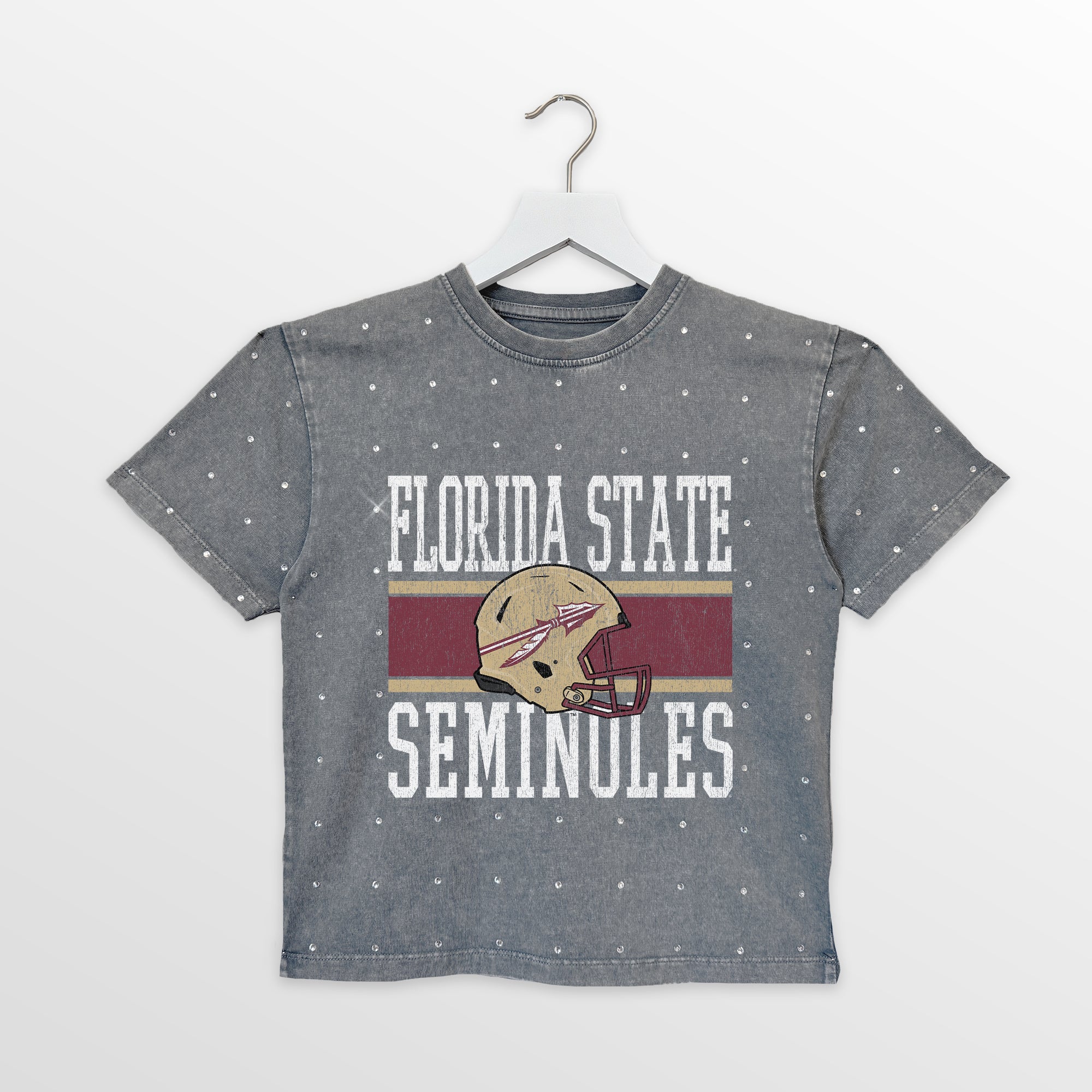 Make a statement in any crowd with our Florida State Seminoles oversized fit, all-over mini rhinestone short sleeve tee featuring a ribbed neckline. Embrace the sparkle while staying comfortable—perfect for every dedicated fan.