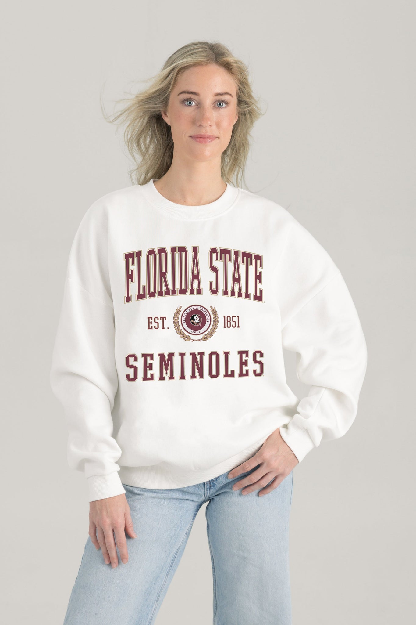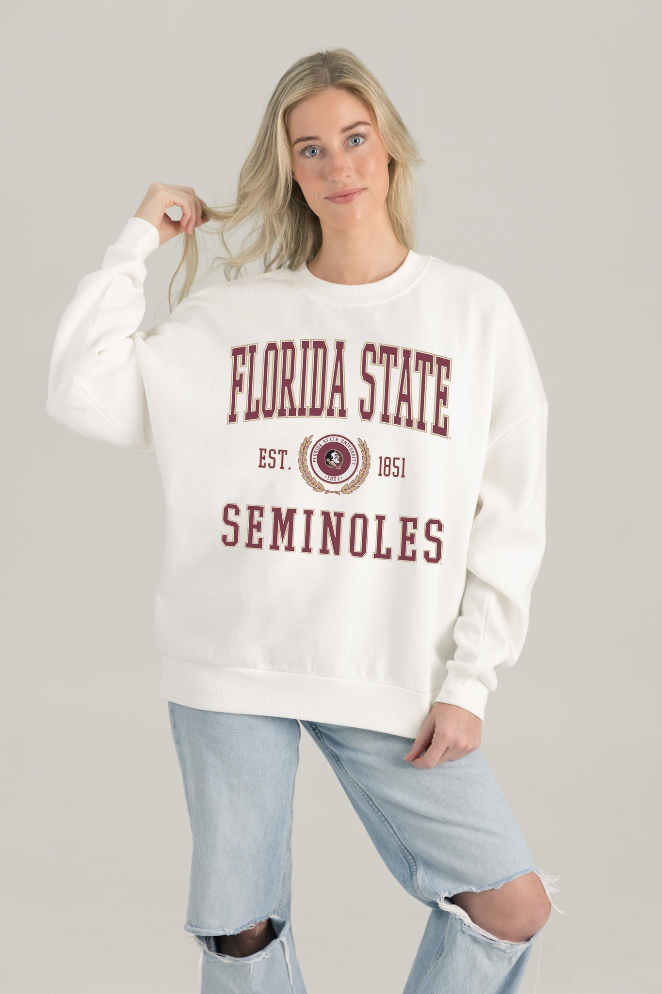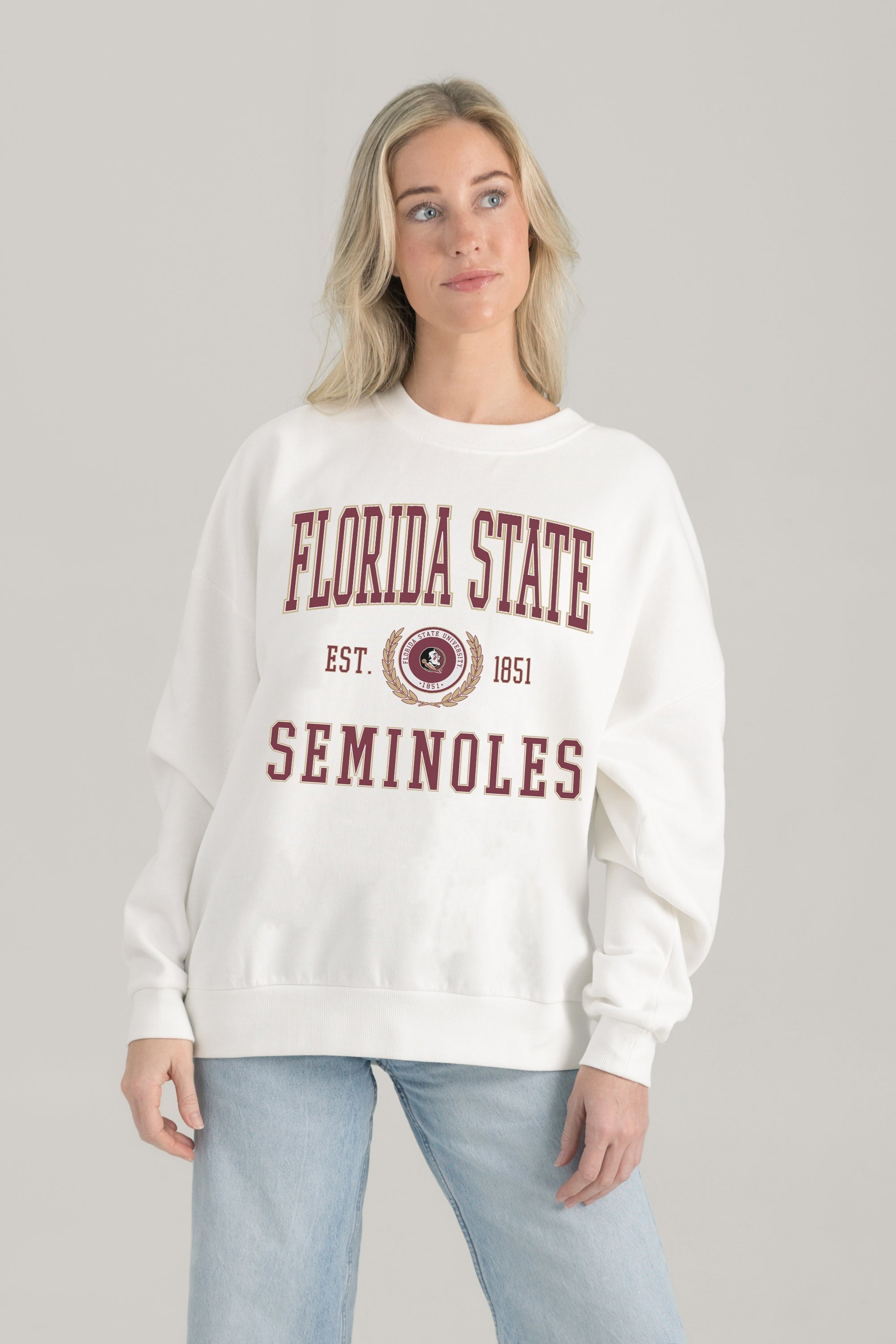 Stand out from the crowd in our Florida State Seminoles premium fleece long sleeve sweatshirt. Boasting an oversized fit, crewneck and ribbed knit neckline, wrists, and waistband, it effortlessly blends comfort with fashion. Show your support for your favorite school or team in this irresistibly soft sweatshirt.