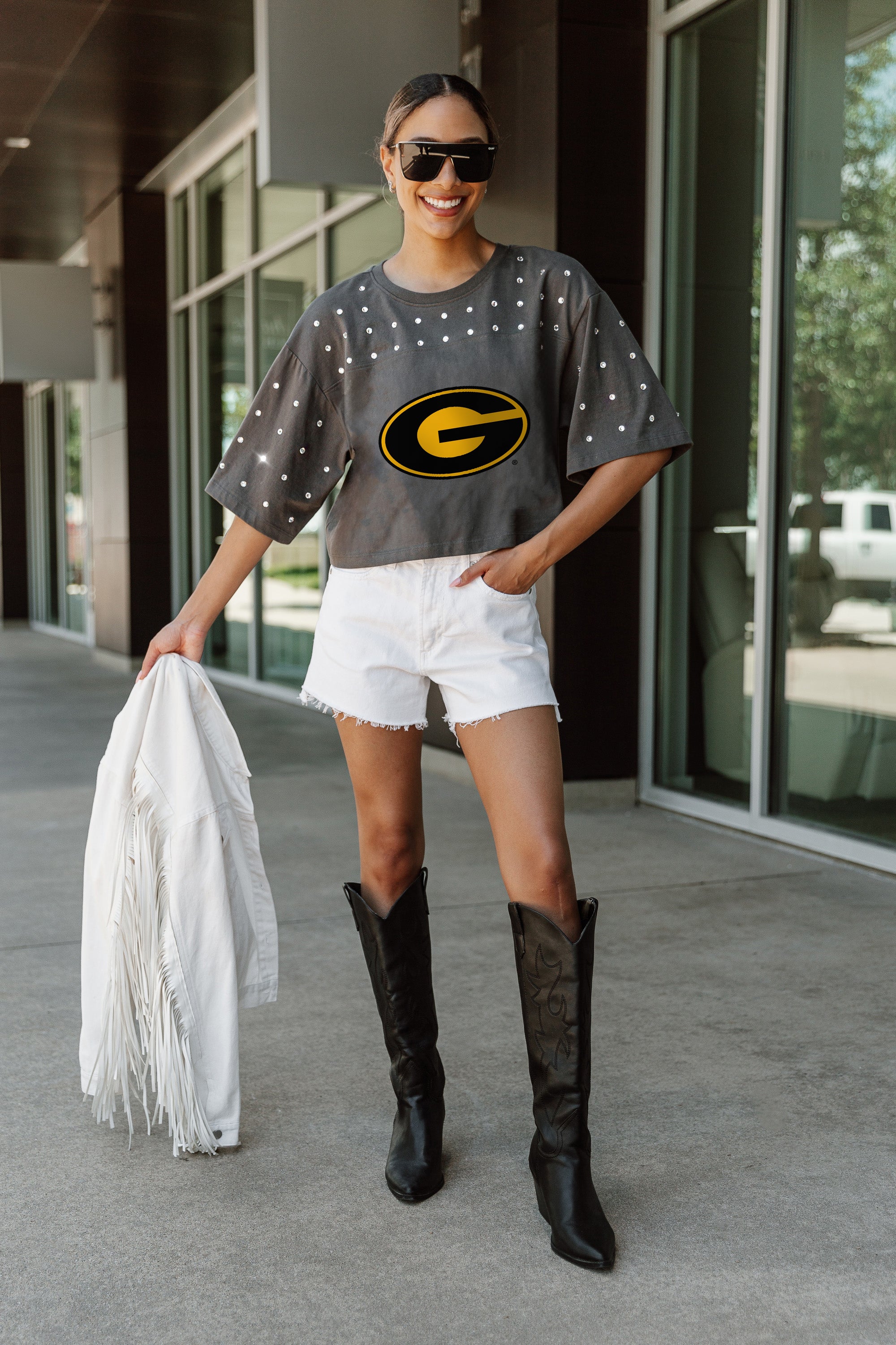 Shine with pride in our Grambling State Tigers all-over rhinestone cropped tee with yoke. Whether you're cheering from the stands or hitting the town, embrace effortless style and comfort while standing out from the crowd.