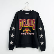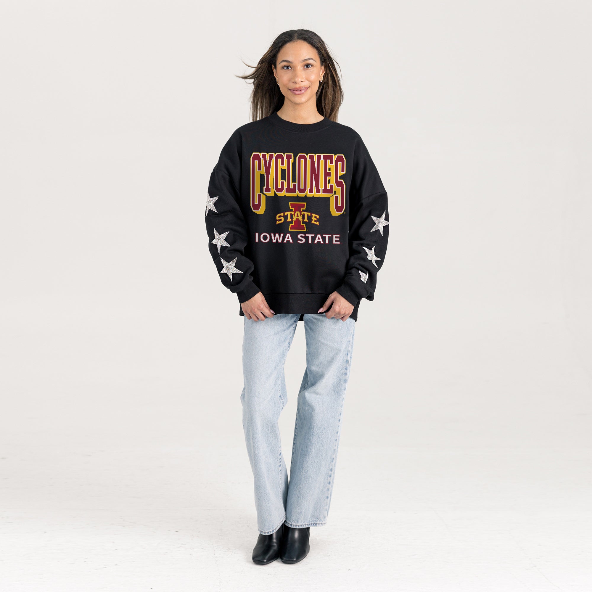 Elevate gameday with our Iowa State Cyclones drop shoulder, long sleeve fleece pullover adorned with rhinestud stars on the sleeves. Shine brightly and show your Iowa State Cyclones pride.