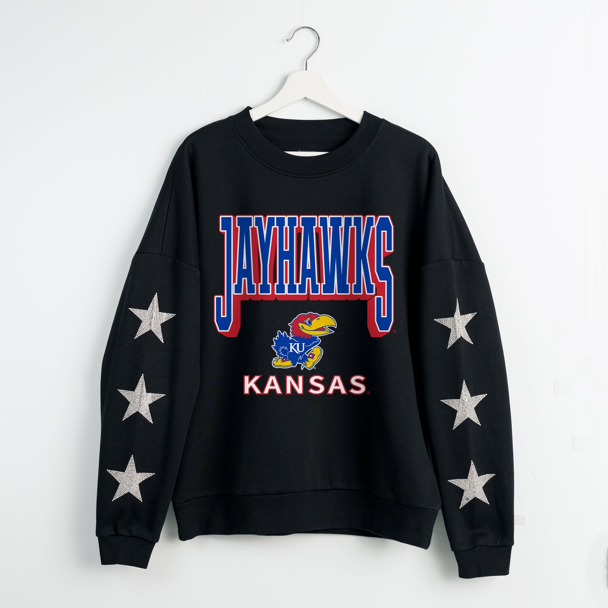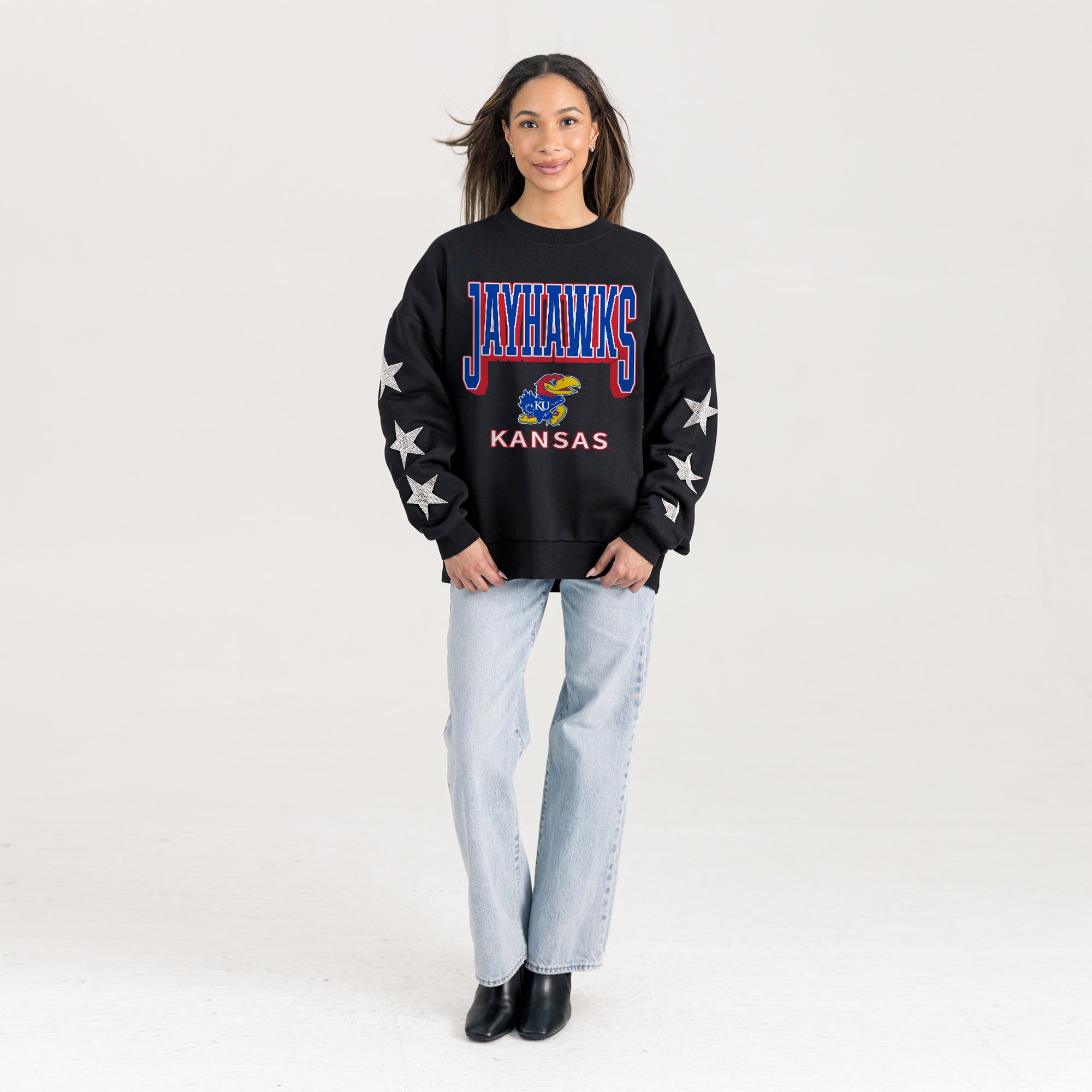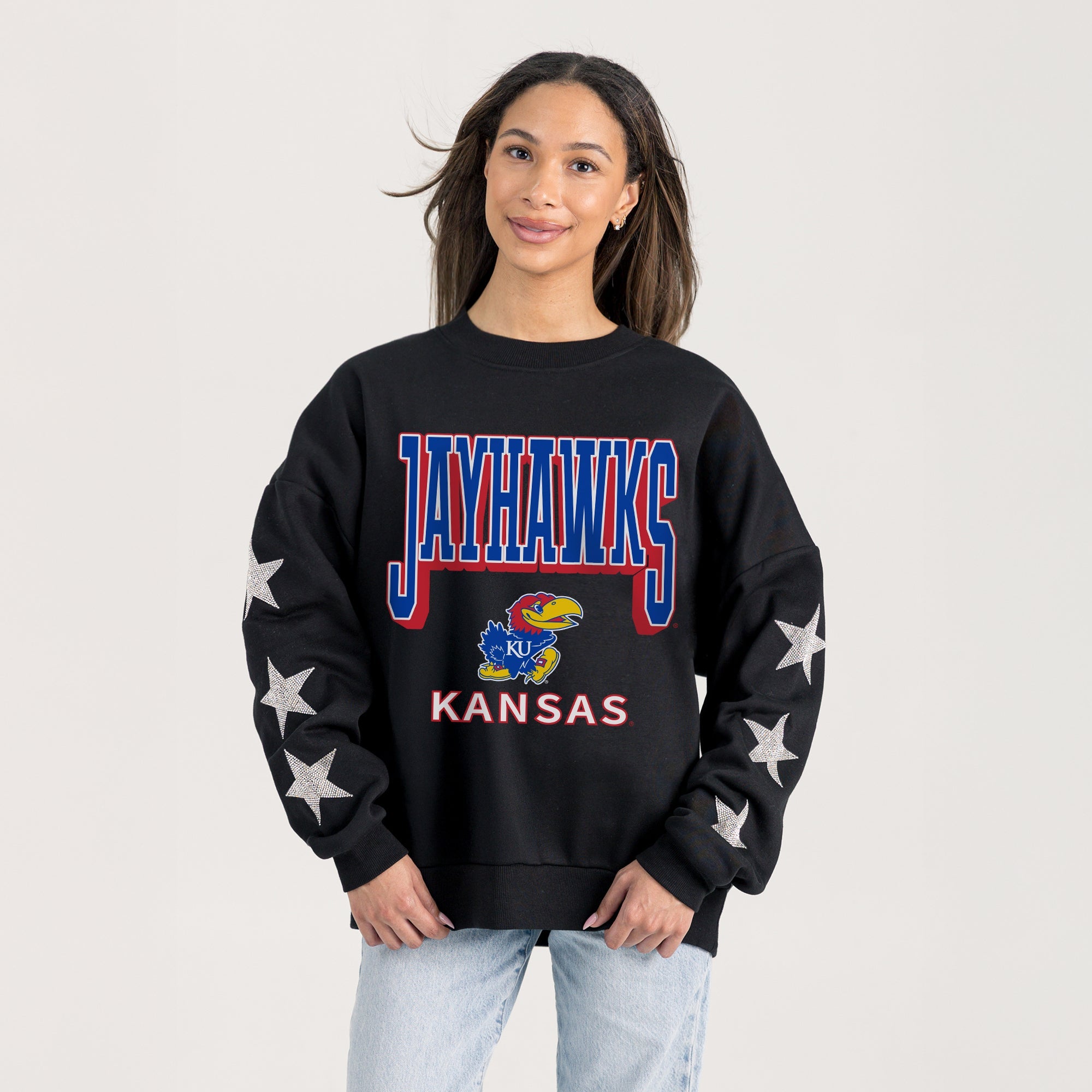 Elevate gameday with our Kansas Jayhawks drop shoulder, long sleeve fleece pullover adorned with rhinestud stars on the sleeves. Shine brightly and show your Kansas Jayhawks pride.