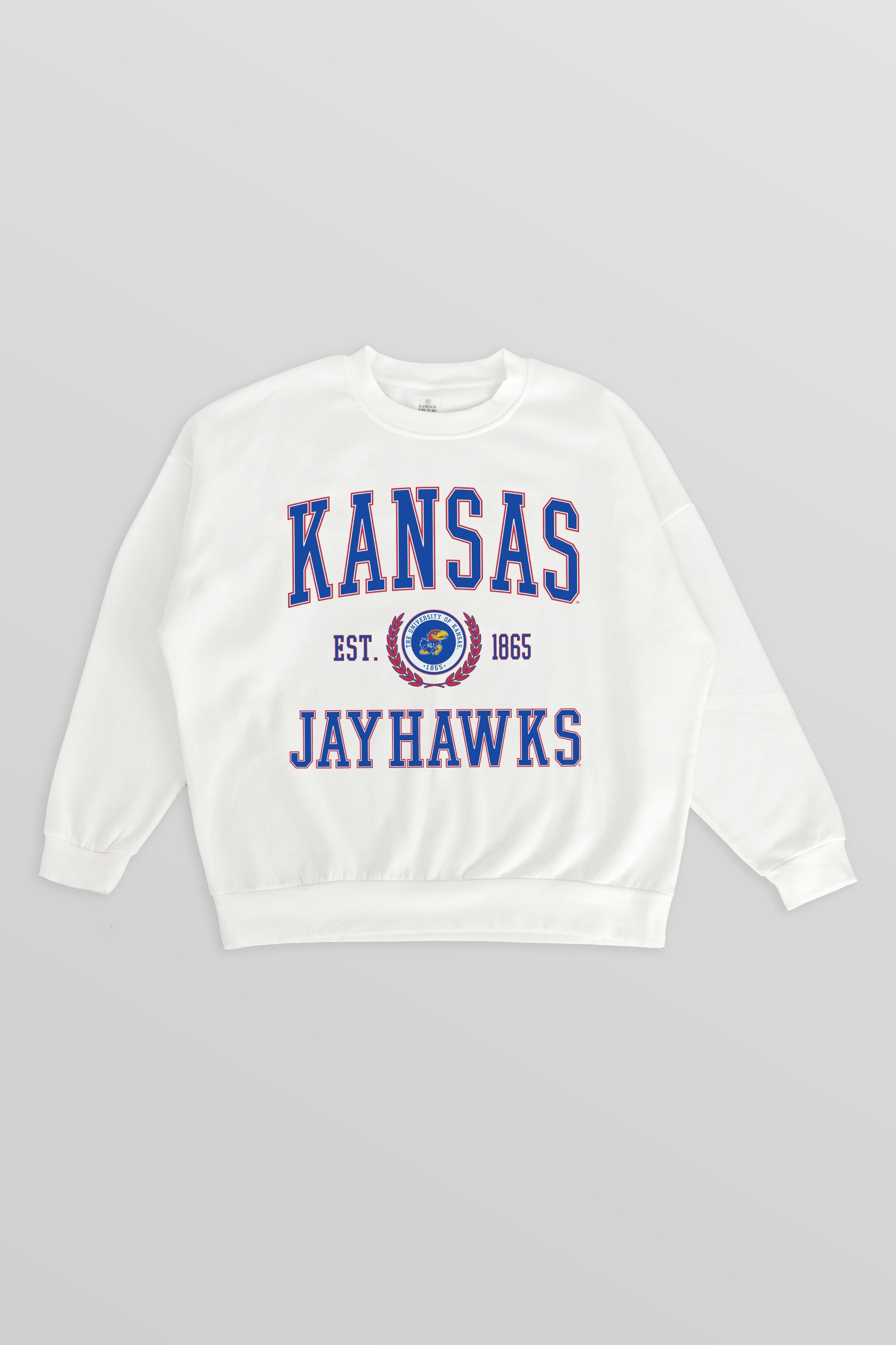 Stand out from the crowd in our Kansas Jayhawks premium fleece long sleeve sweatshirt. Boasting an oversized fit, crewneck and ribbed knit neckline, wrists, and waistband, it effortlessly blends comfort with fashion. Show your support for your favorite school or team in this irresistibly soft sweatshirt.