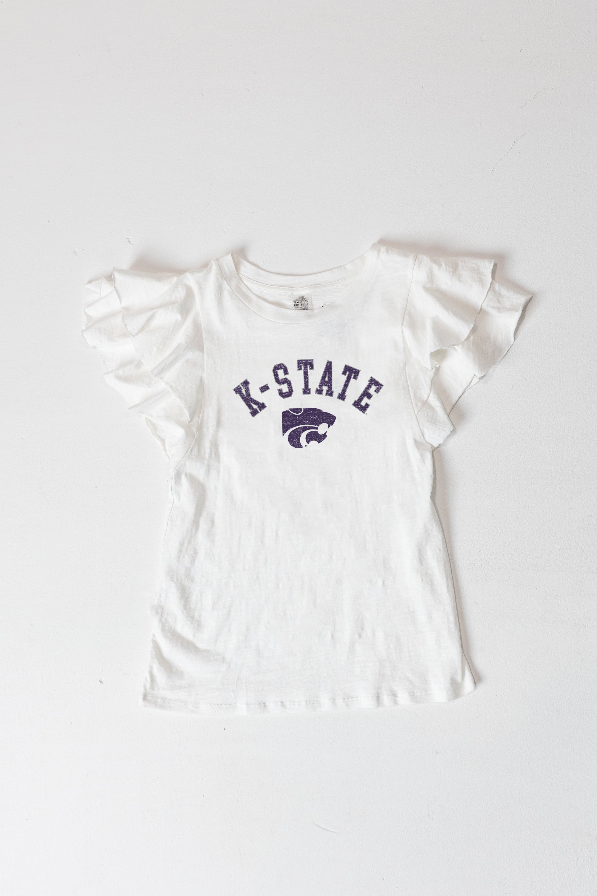 Feel the excitement of game day with our Kansas State Wildcats flutter sleeve crewneck top. This short sleeve ruffle sleeve slub knit top is a versatile addition to any wardrobe. Perfect for fans who want to look good and feel great.