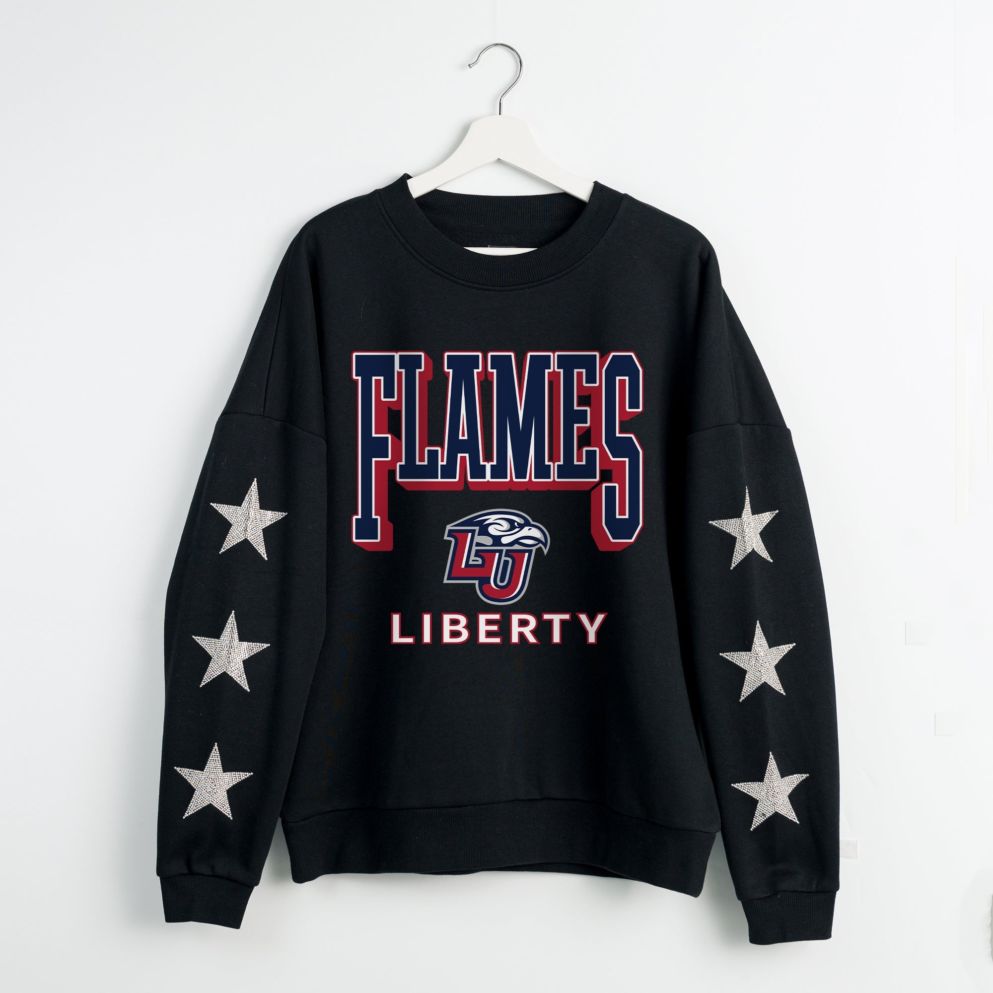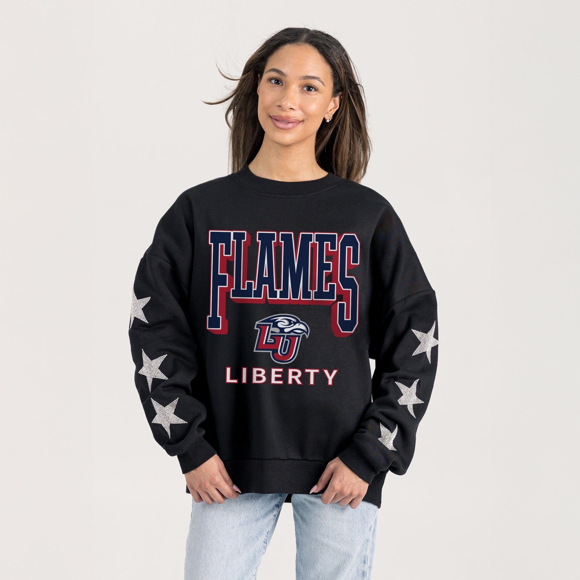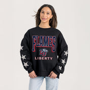Elevate gameday with our Liberty Flames drop shoulder, long sleeve fleece pullover adorned with rhinestud stars on the sleeves. Shine brightly and show your Liberty Flames pride.