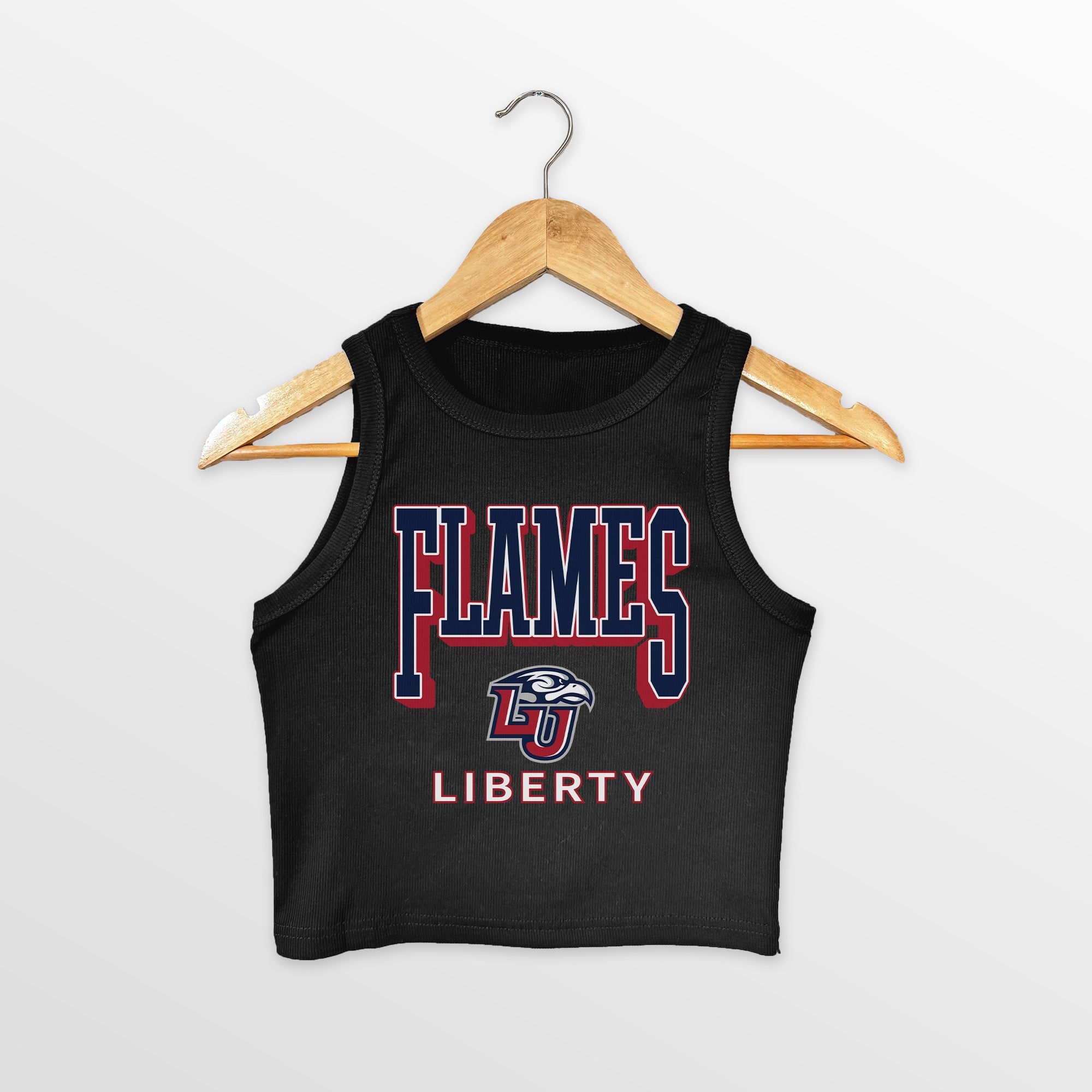 This essential ribbed crop tank is perfect for game day or everyday wear. Cheer on the Liberty Flames with this winning style. The ribbed fabric is soft and comfortable, and the cropped length is perfect for pairing with high-waisted jeans or shorts.