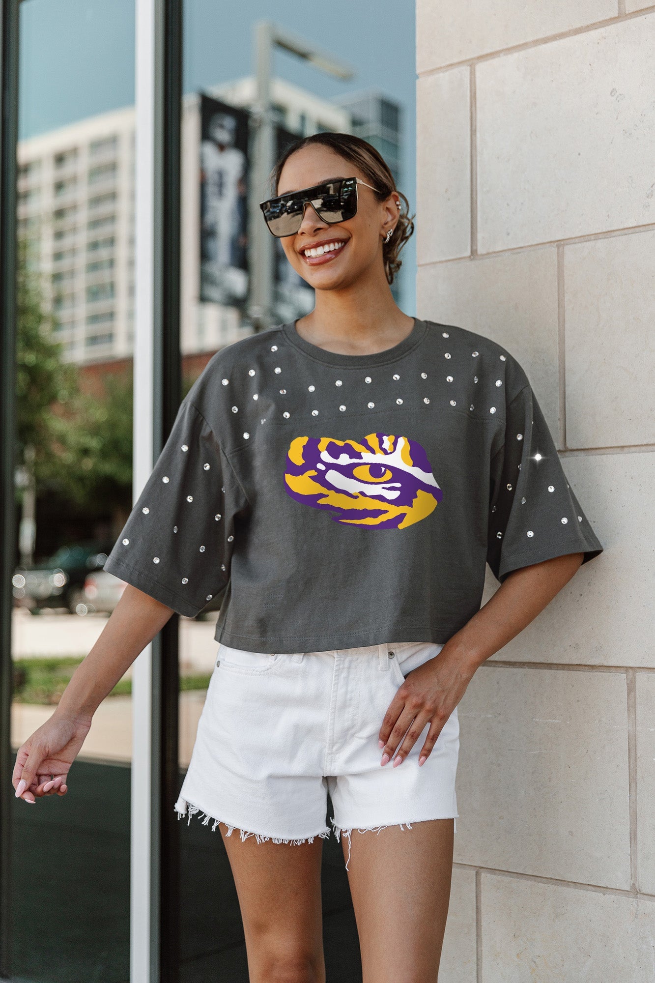 Shine with pride in our Lsu Tigers all-over rhinestone cropped tee with yoke. Whether you're cheering from the stands or hitting the town, embrace effortless style and comfort while standing out from the crowd.