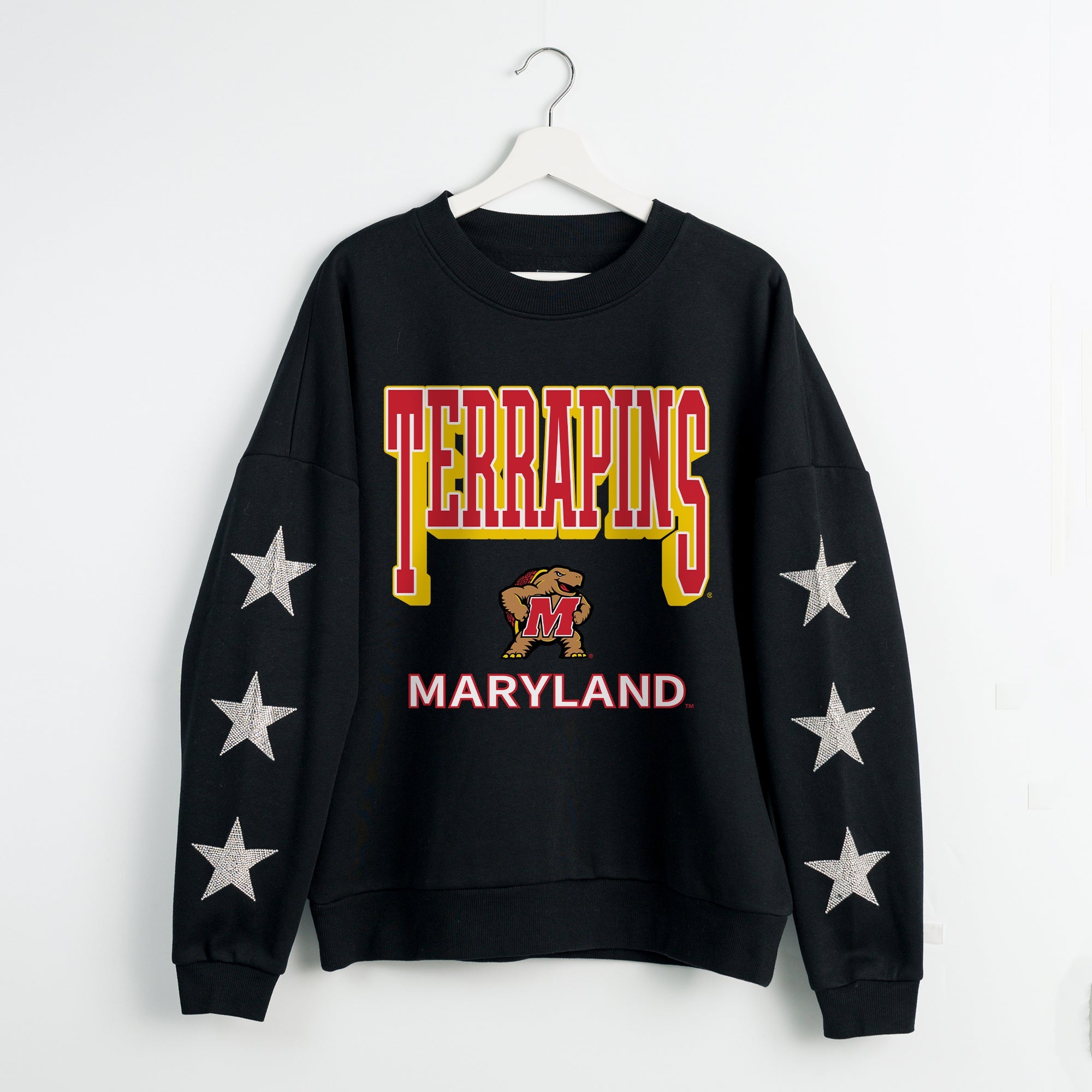 Elevate gameday with our Maryland Terrapins drop shoulder, long sleeve fleece pullover adorned with rhinestud stars on the sleeves. Shine brightly and show your Maryland Terrapins pride.