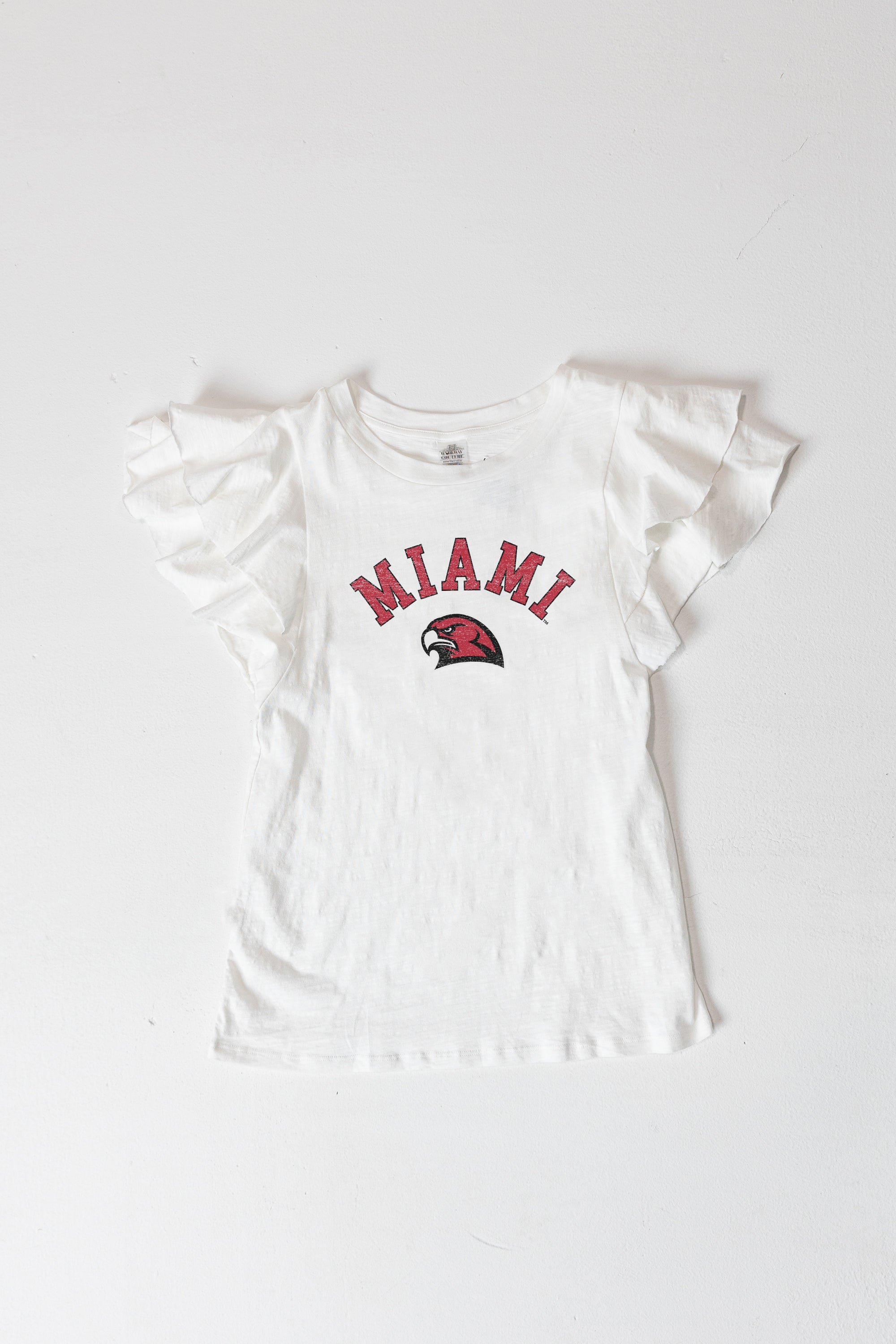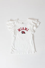 Feel the excitement of game day with our Miami Of Ohio Redhawks flutter sleeve crewneck top. This short sleeve ruffle sleeve slub knit top is a versatile addition to any wardrobe. Perfect for fans who want to look good and feel great.