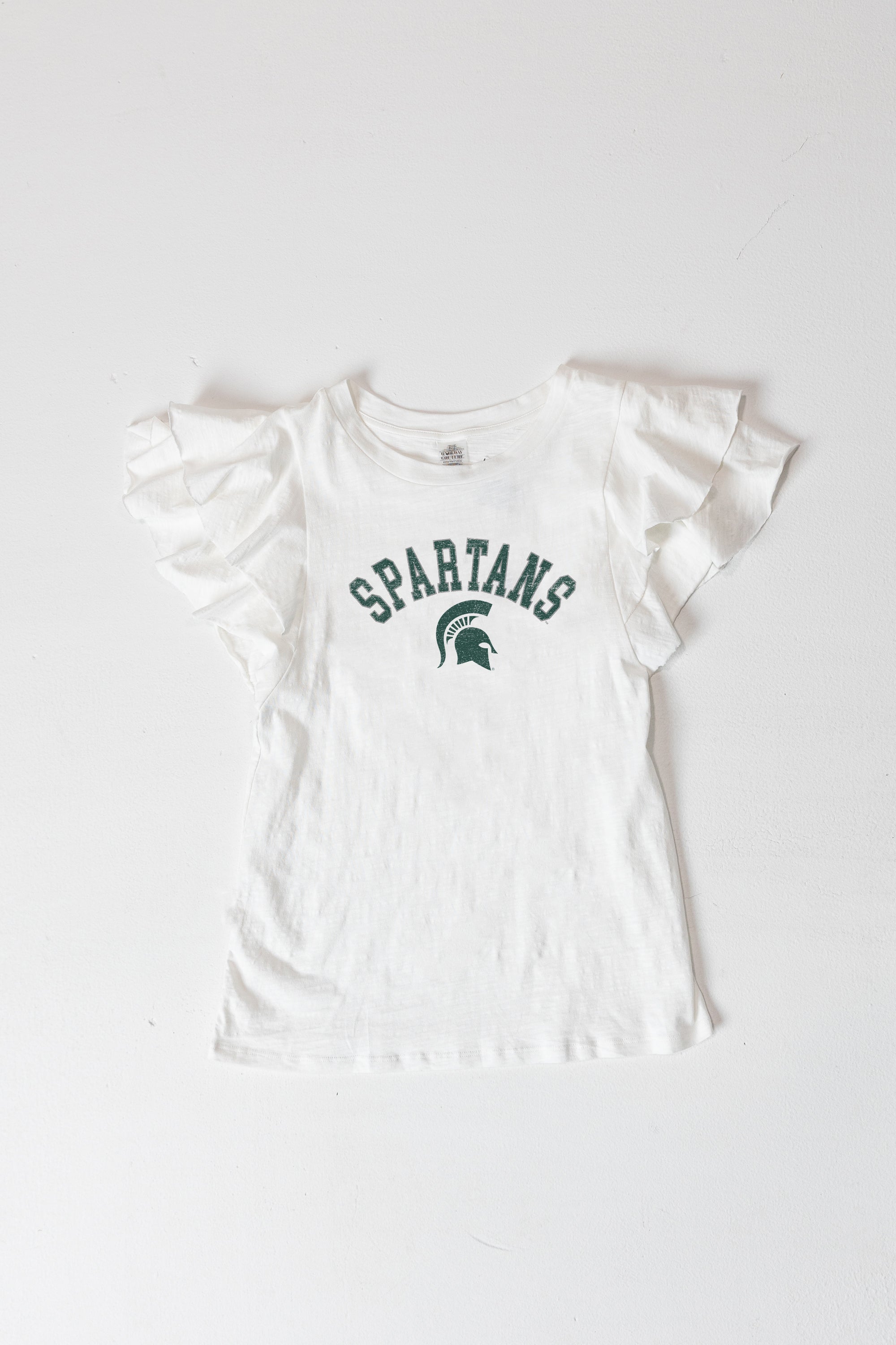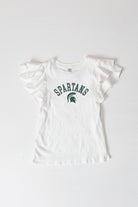 Feel the excitement of game day with our Michigan State Spartans flutter sleeve crewneck top. This short sleeve ruffle sleeve slub knit top is a versatile addition to any wardrobe. Perfect for fans who want to look good and feel great.