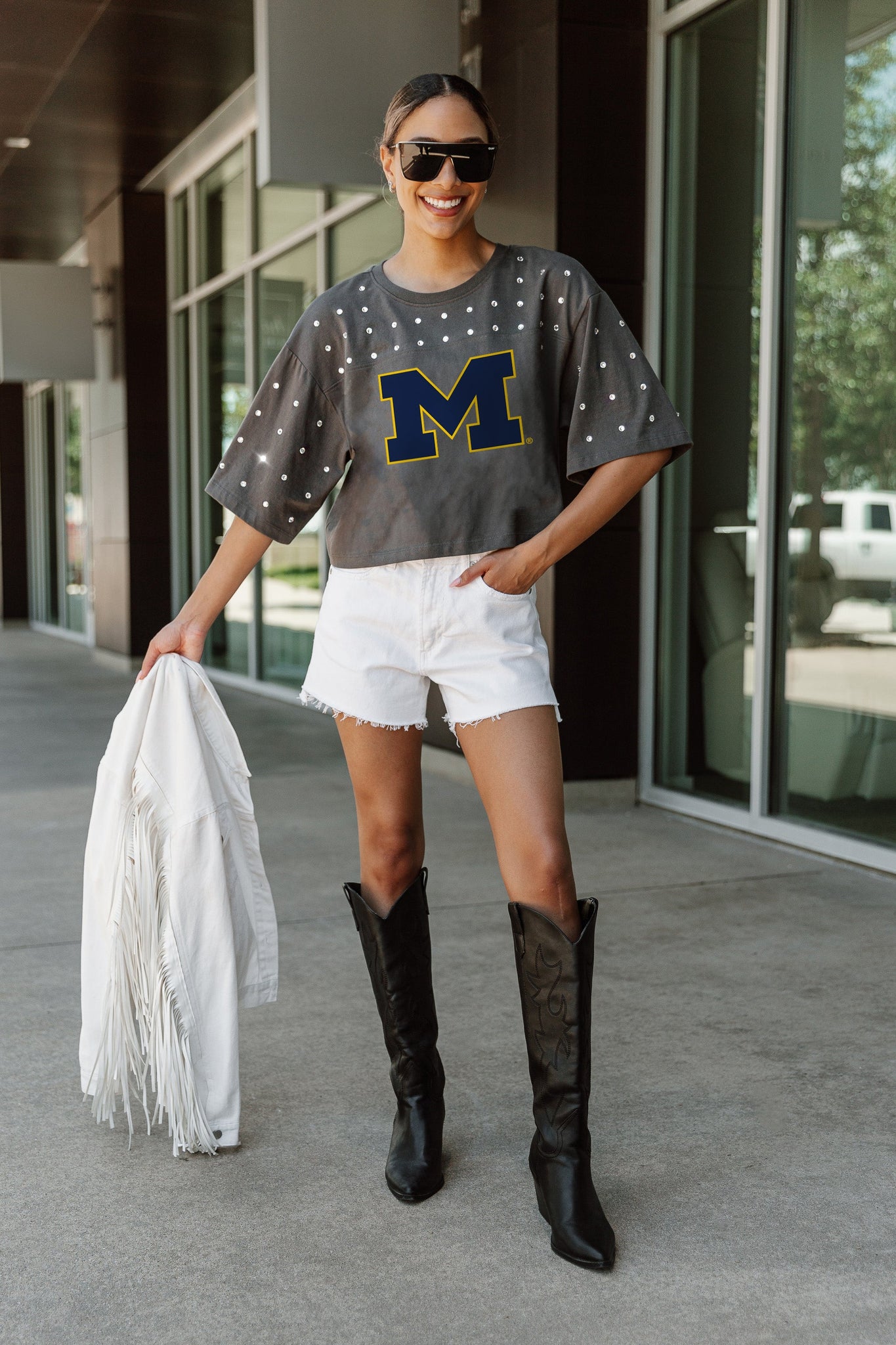 Shine with pride in our Michigan Wolverines all-over rhinestone cropped tee with yoke. Whether you're cheering from the stands or hitting the town, embrace effortless style and comfort while standing out from the crowd.