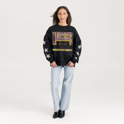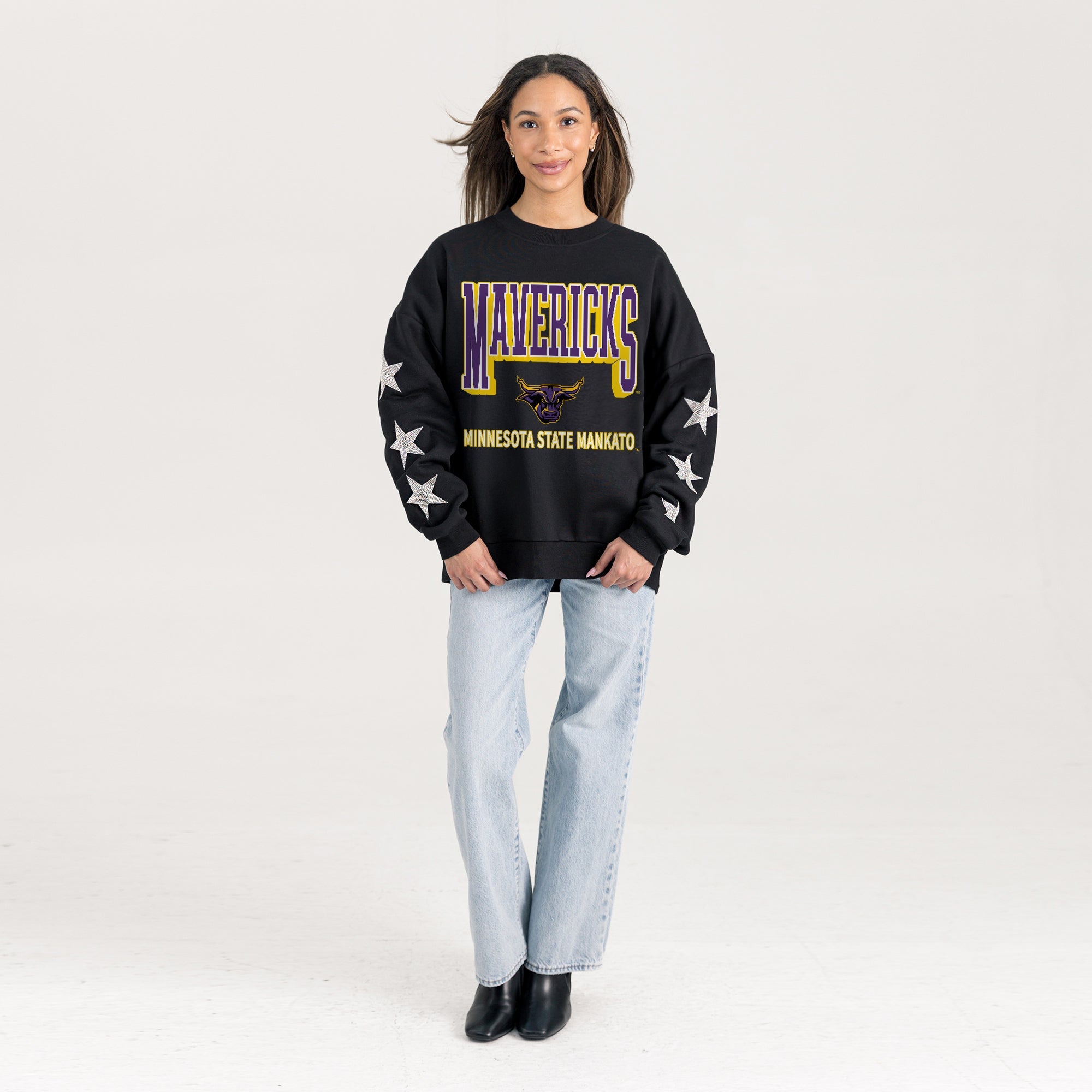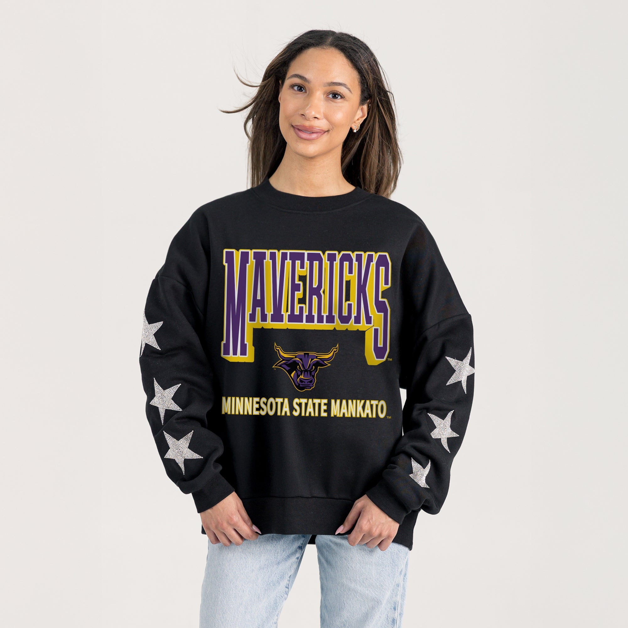 Elevate gameday with our Minnesota State Mankato Mavericks drop shoulder, long sleeve fleece pullover adorned with rhinestud stars on the sleeves. Shine brightly and show your Minnesota State Mankato Mavericks pride.
