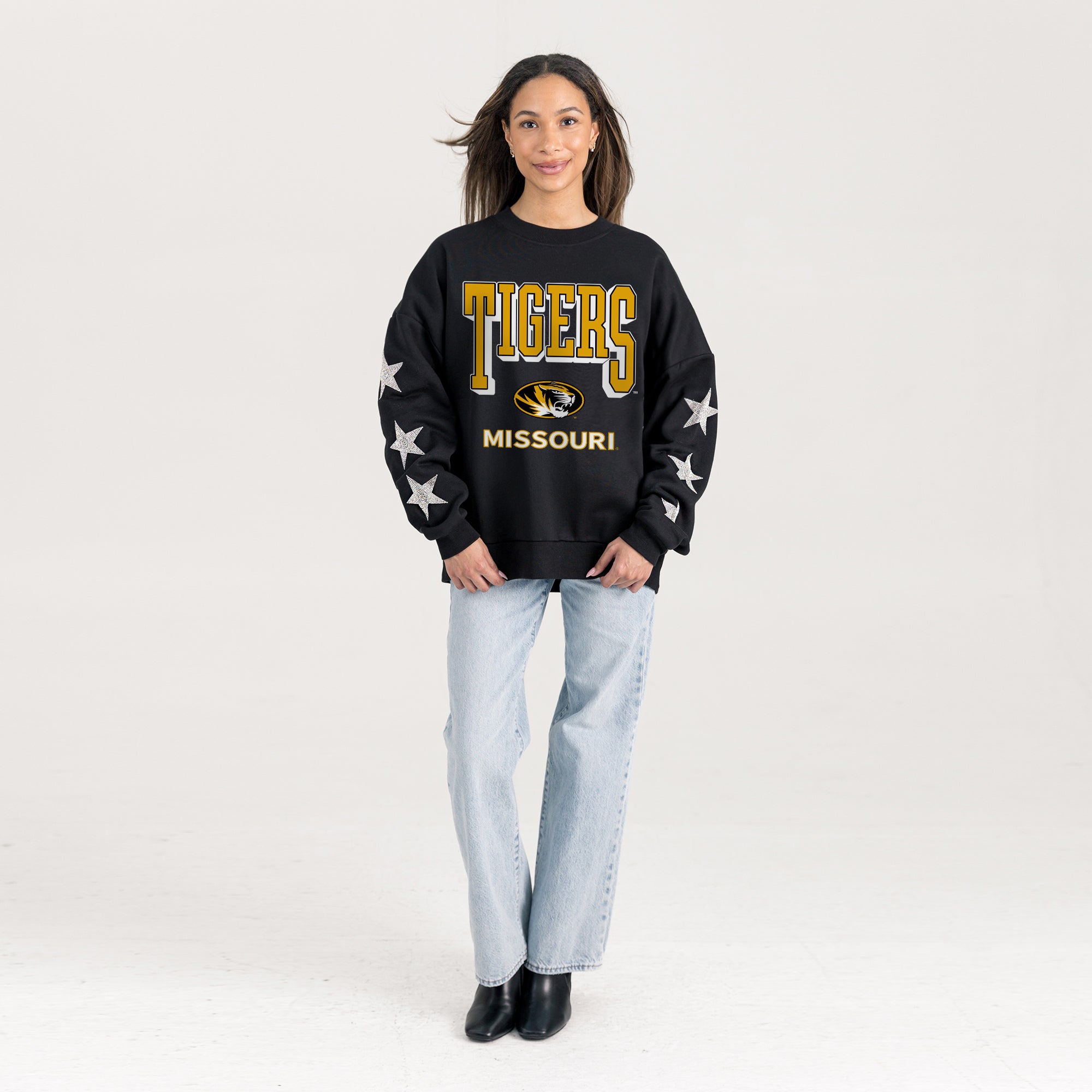 Elevate gameday with our Missouri Tigers drop shoulder, long sleeve fleece pullover adorned with rhinestud stars on the sleeves. Shine brightly and show your Missouri Tigers pride.