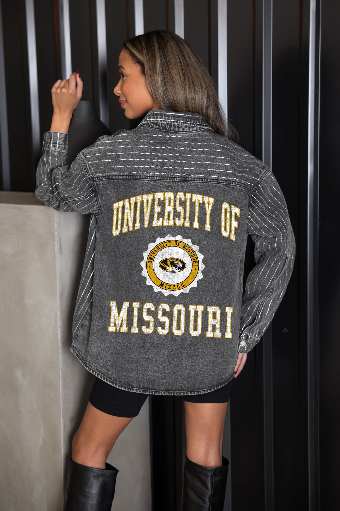 MISSOURI TIGERS STYLE'S THE LIMIT MICRO-RHINESTONE DENIM OVERSHIRT IN BLACK