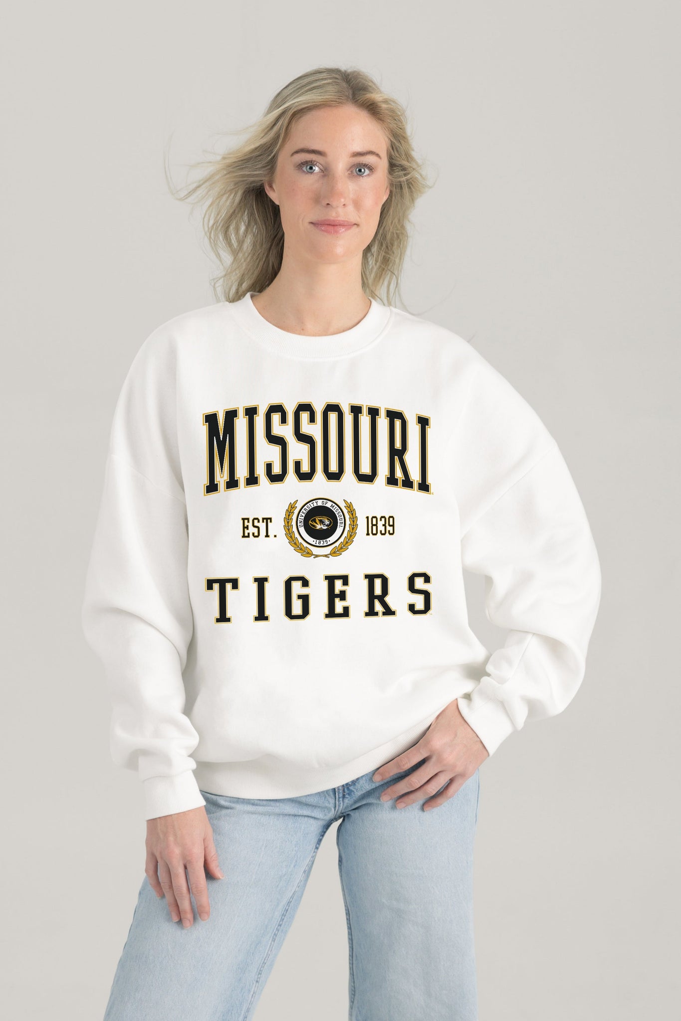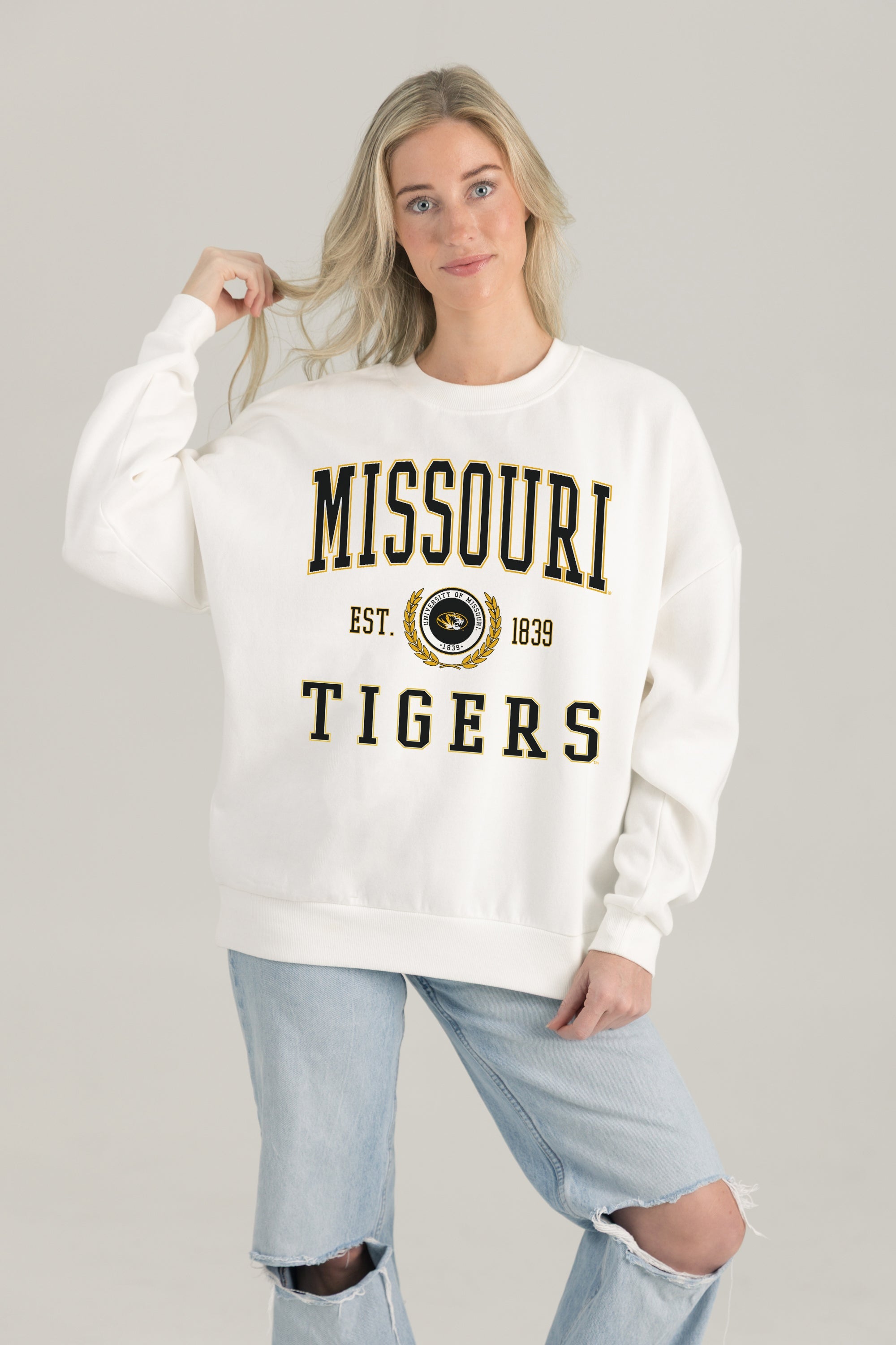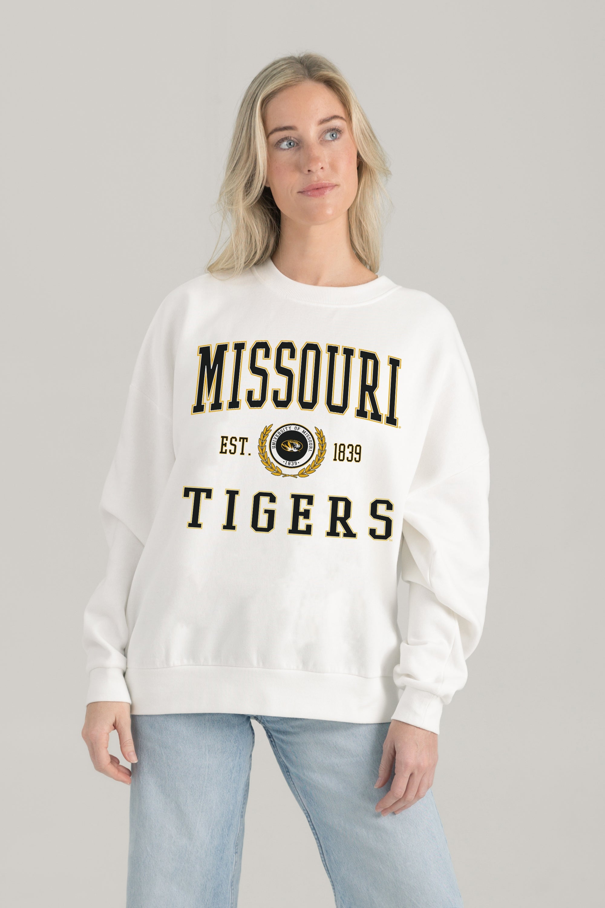 Stand out from the crowd in our Missouri Tigers premium fleece long sleeve sweatshirt. Boasting an oversized fit, crewneck and ribbed knit neckline, wrists, and waistband, it effortlessly blends comfort with fashion. Show your support for your favorite school or team in this irresistibly soft sweatshirt.