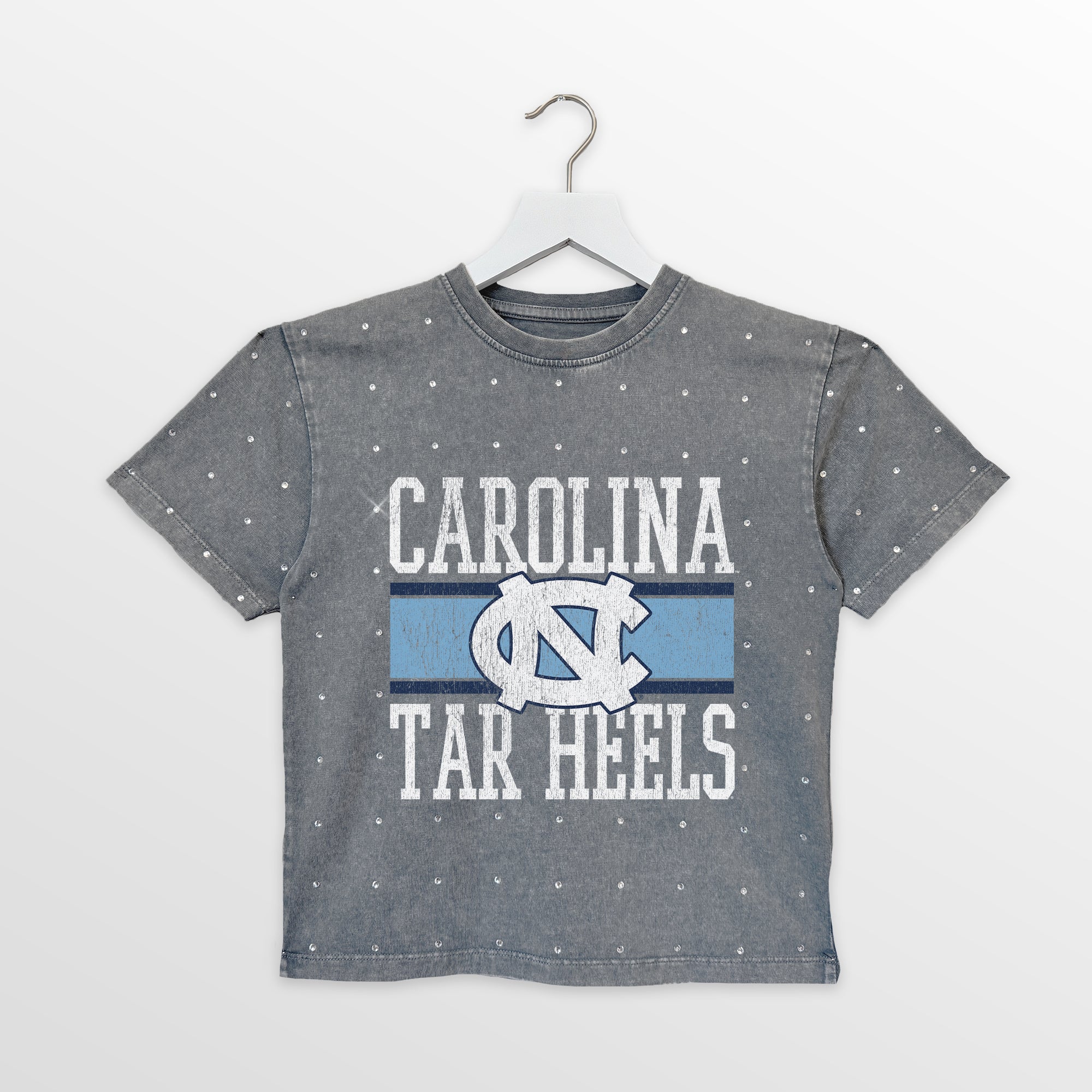 Make a statement in any crowd with our North Carolina Tar Heels oversized fit, all-over mini rhinestone short sleeve tee featuring a ribbed neckline. Embrace the sparkle while staying comfortable—perfect for every dedicated fan.