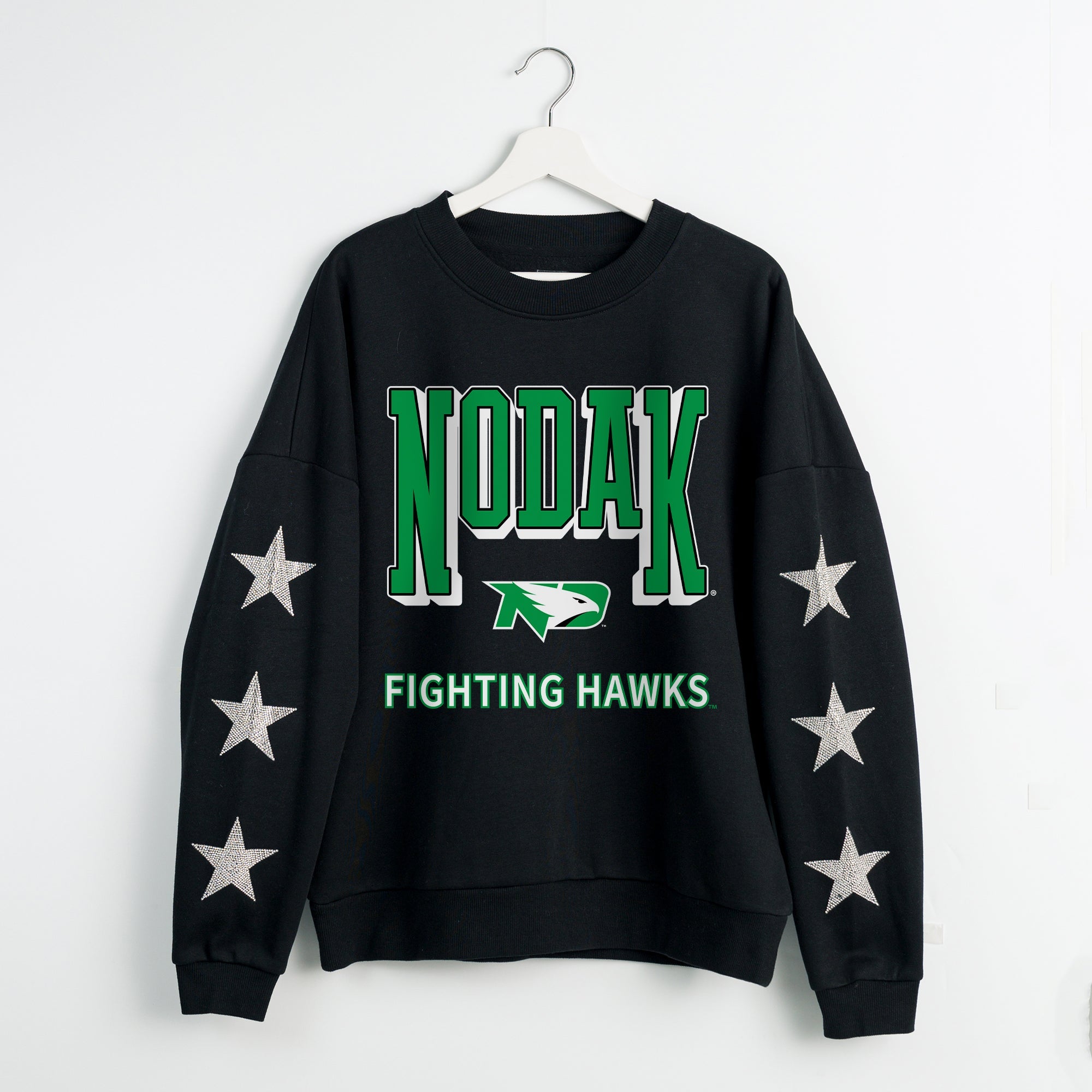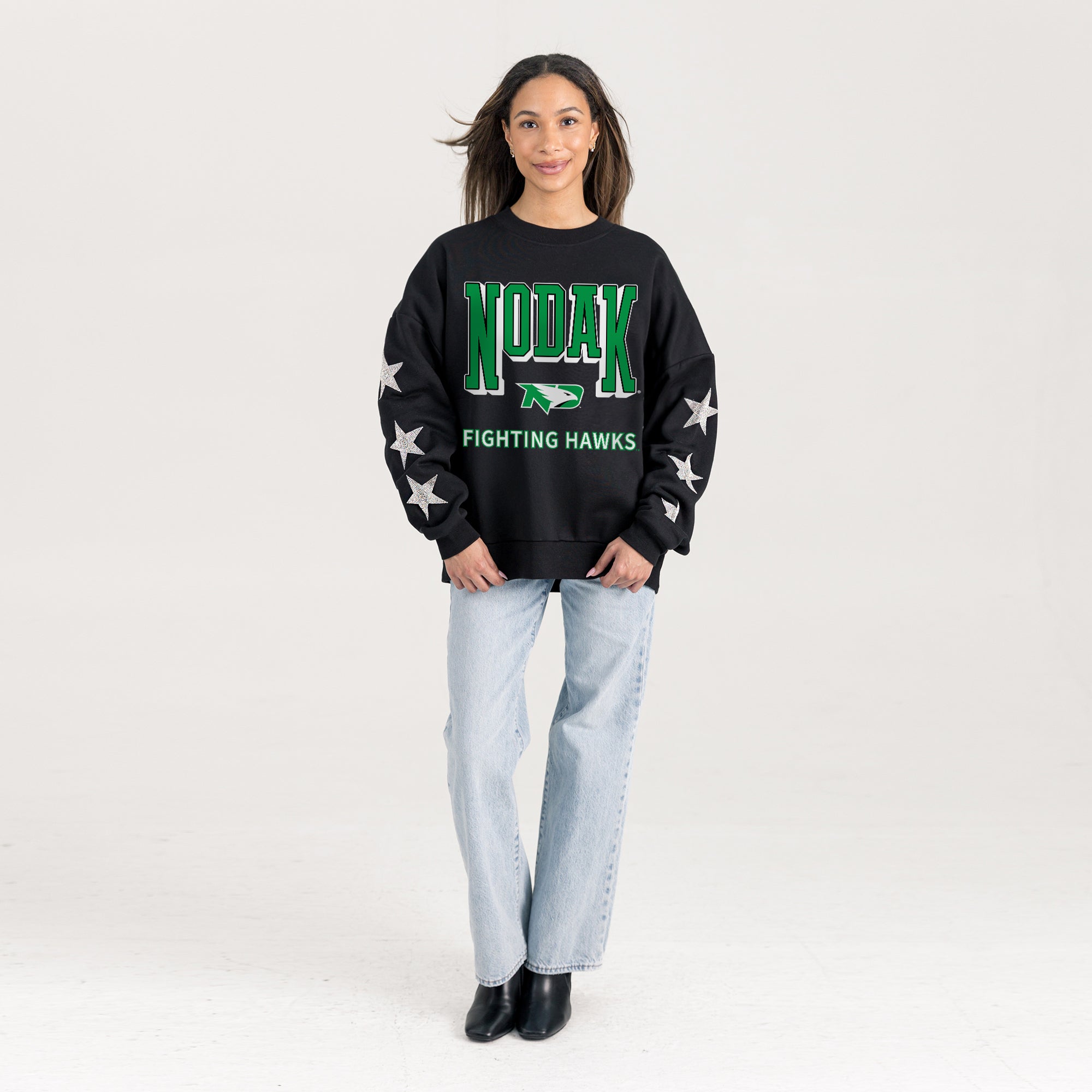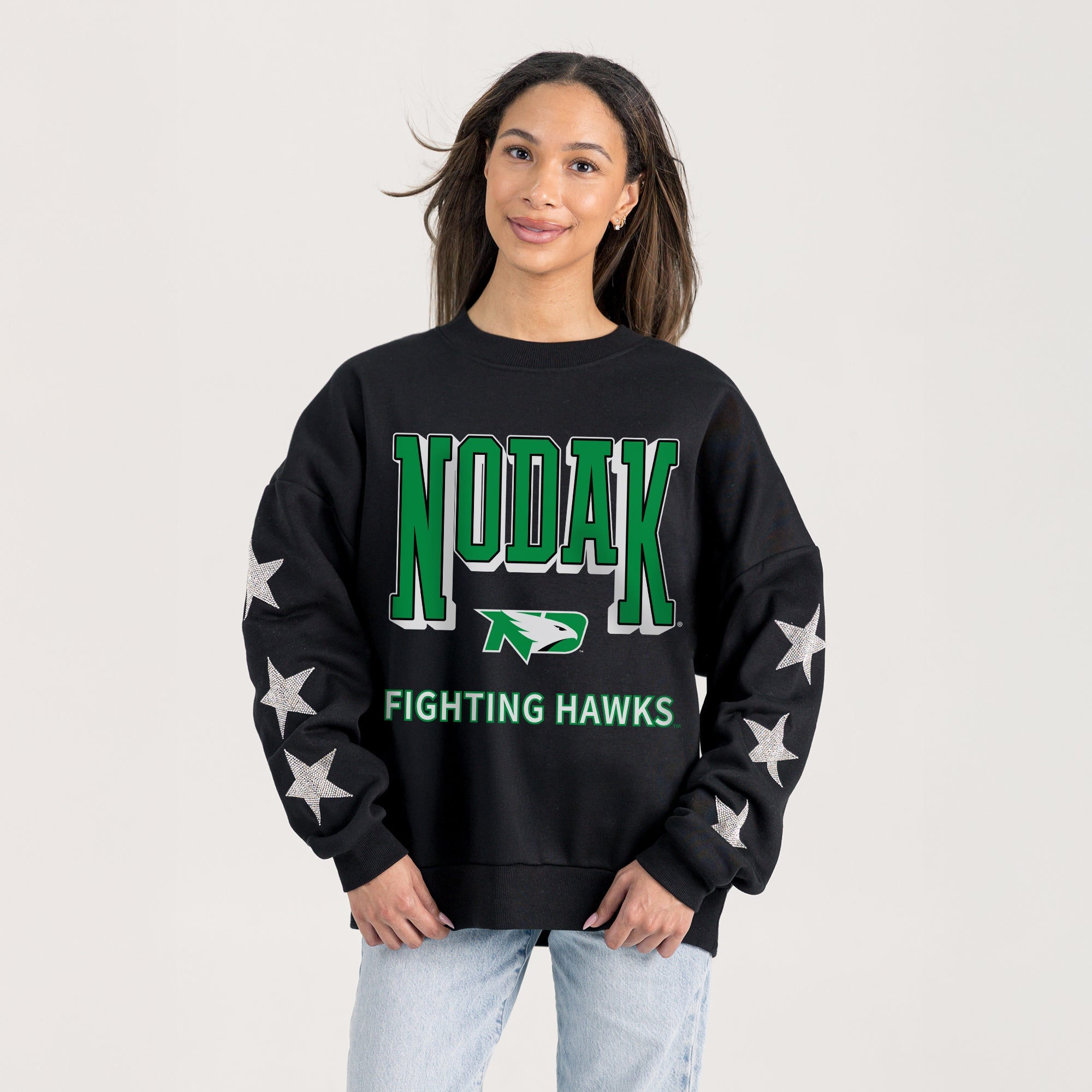Elevate gameday with our North Dakota Fighting Hawks drop shoulder, long sleeve fleece pullover adorned with rhinestud stars on the sleeves. Shine brightly and show your North Dakota Fighting Hawks pride.