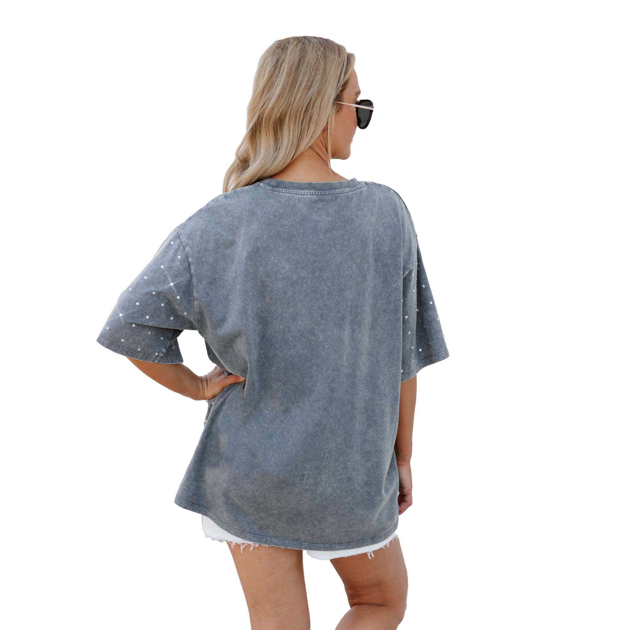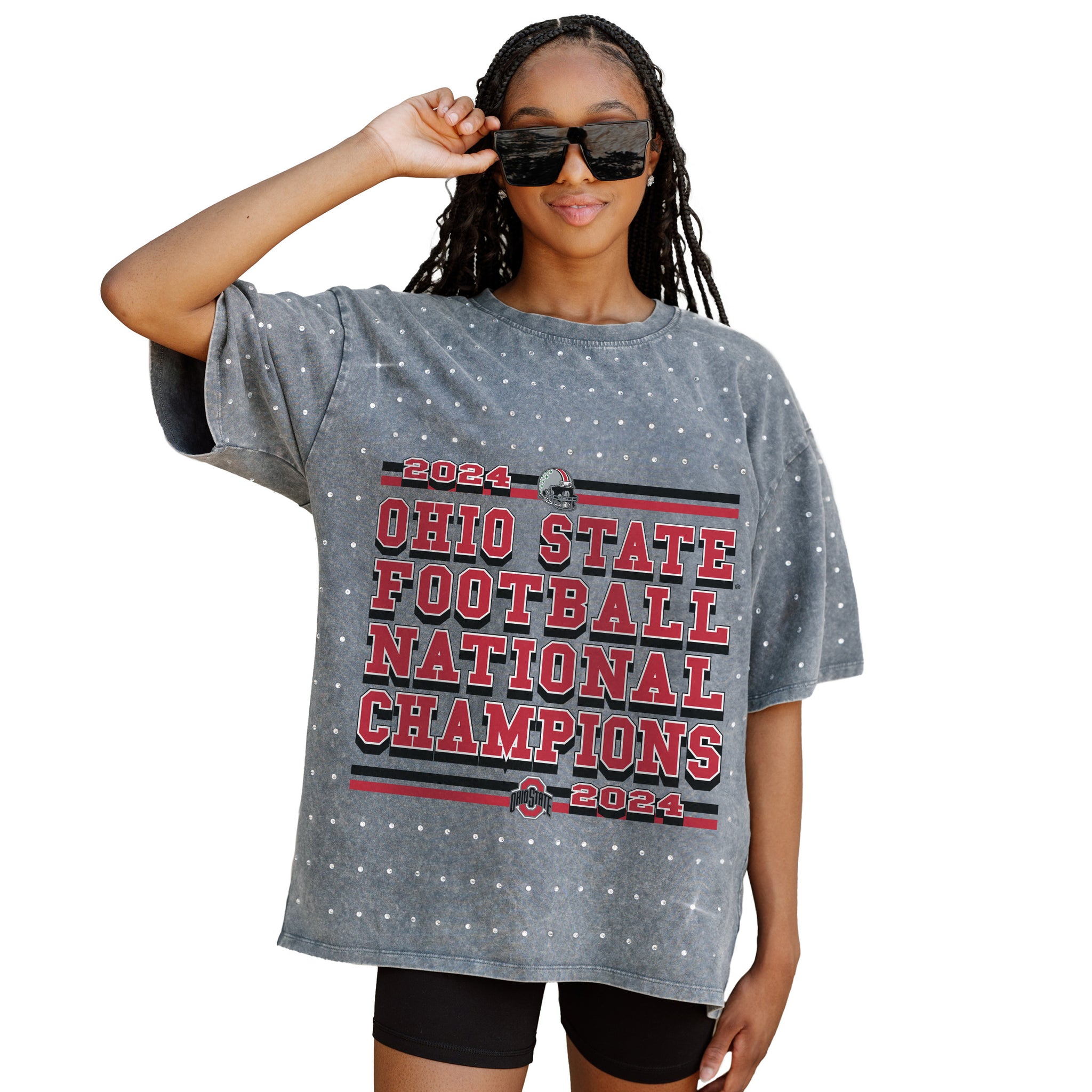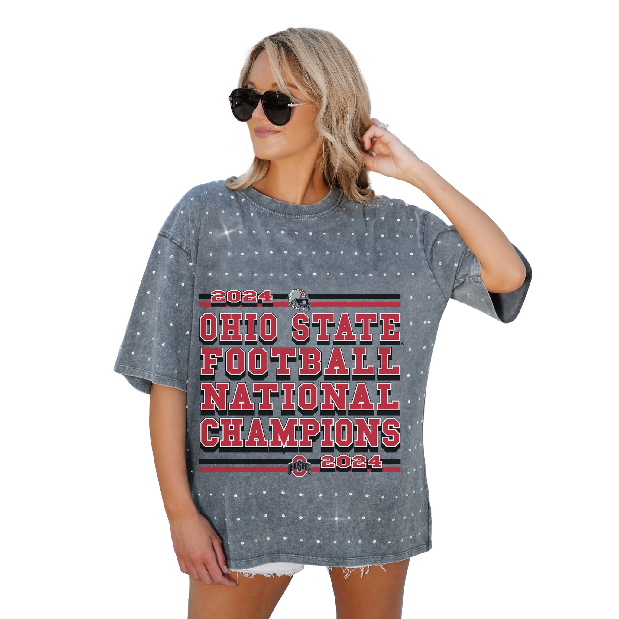 Celebrate your 2024 College Football National Champs while standing out in any crowd with our oversized fit, mini rhinestone short sleeve tee with ribbed neckline. Made with 100% cotton, any fan will be sure to bring the sparkle without compromising comfort.