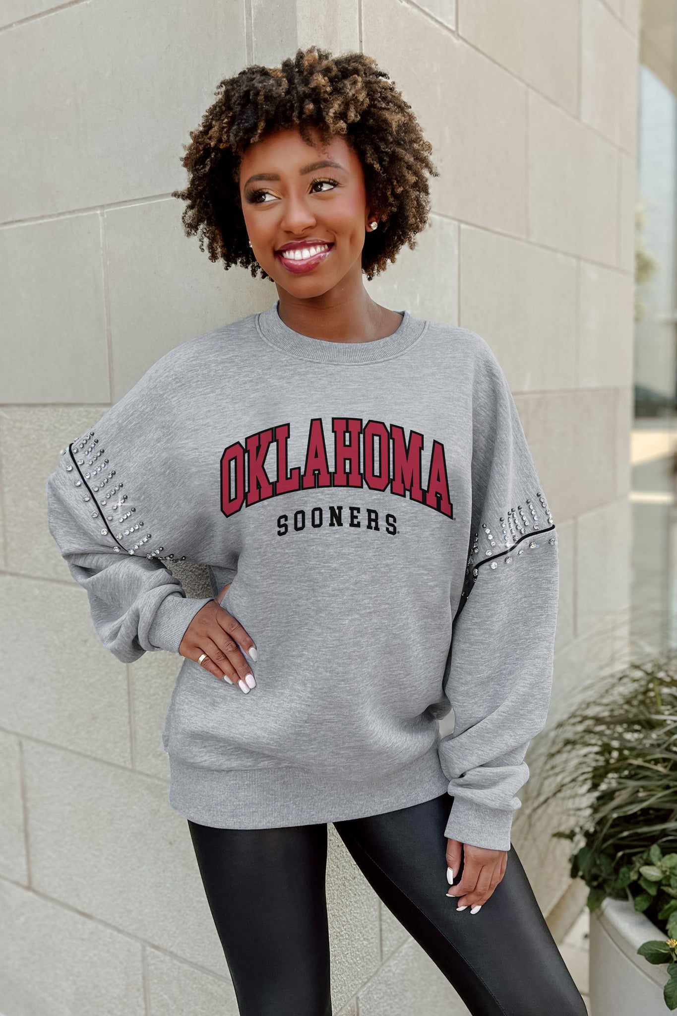 Shine in style with our Oklahoma Sooners oversized long sleeve crewneck fleece pullover, adorned with sparkling jewel shoulder embellishments. Designed with a relaxed drop shoulder silhouette and enhanced by dazzling inset rhinestones and hematite beads, this pullover promises to make a bold statement.