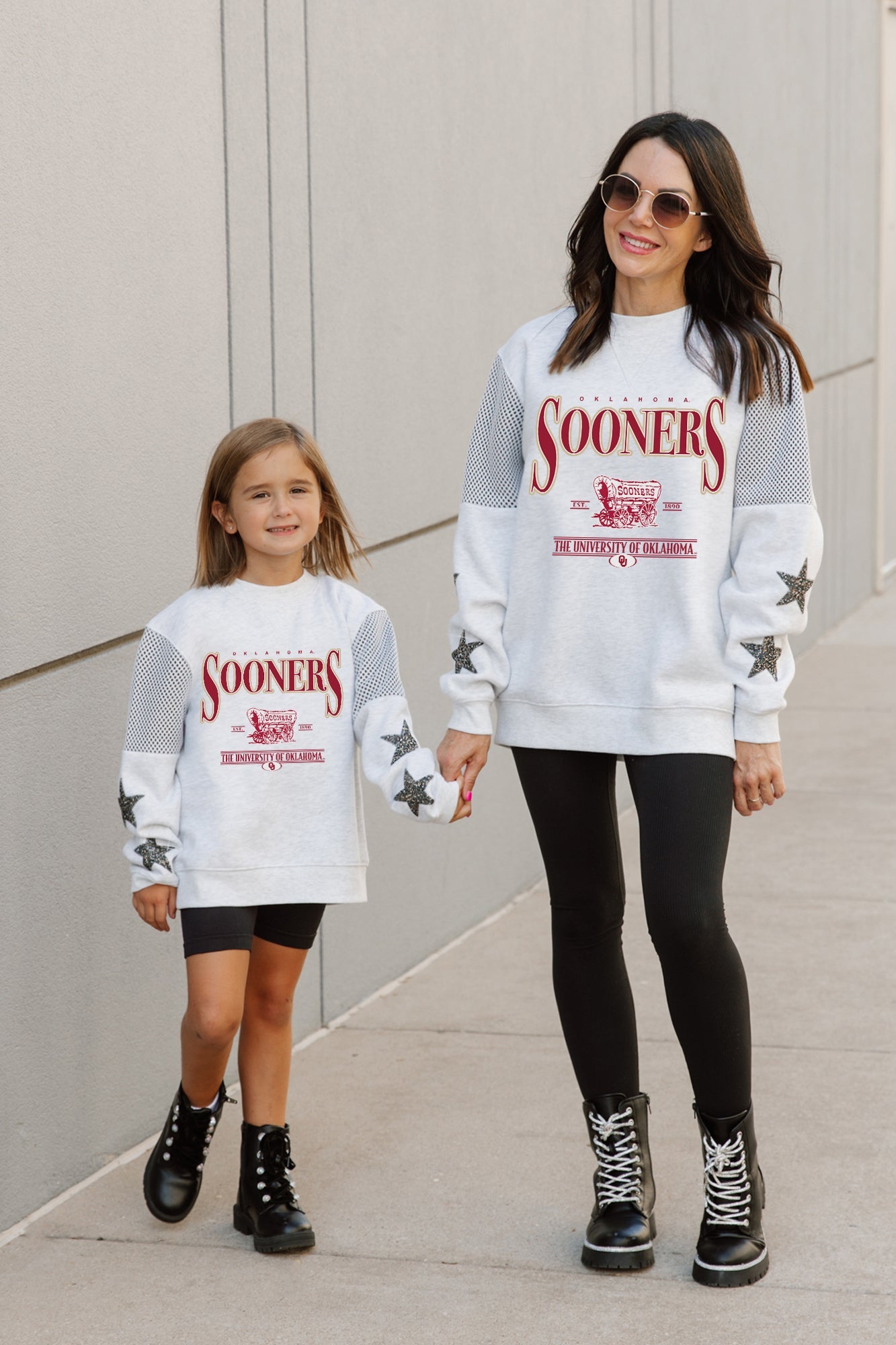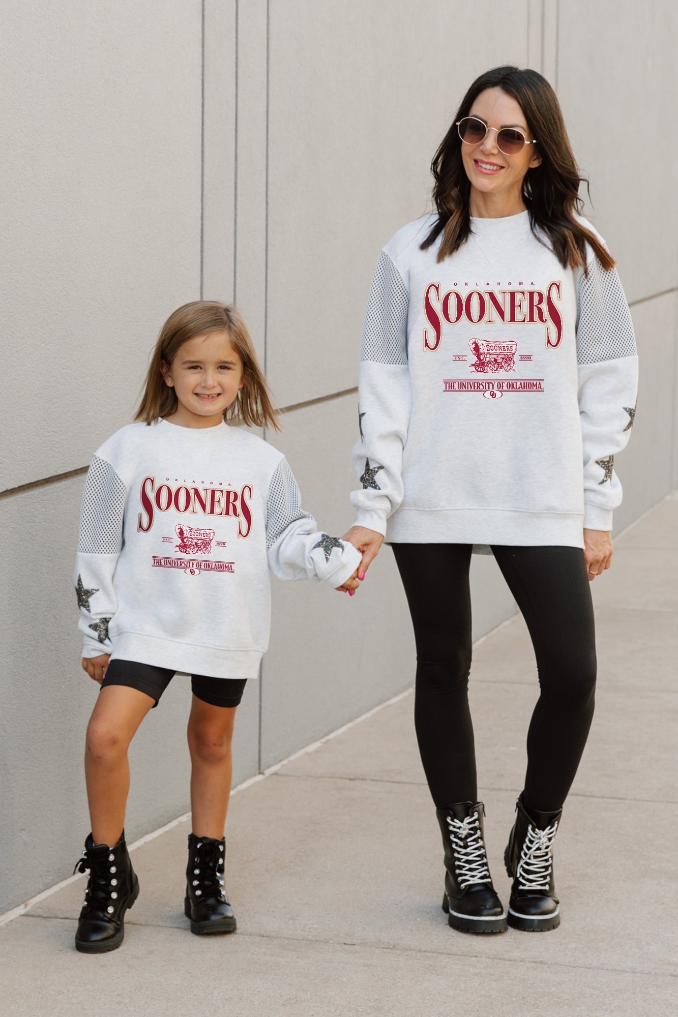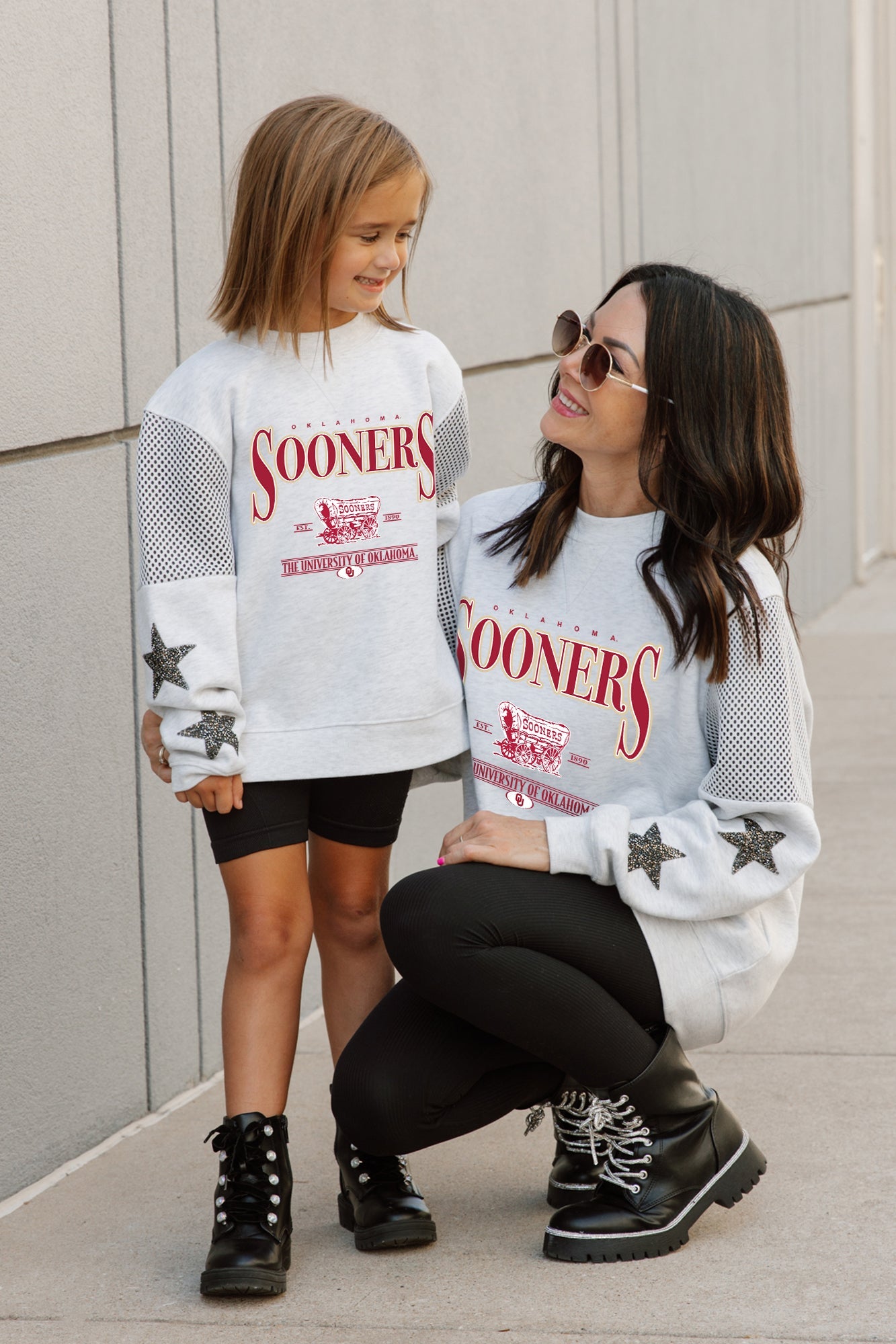Make a bold statement with our Oklahoma Sooners long sleeve crewneck fleece, designed to turn heads effortlessly. Featuring contrasting jersey mesh upper arm inserts and dazzling rhinestud stars on the sleeves, this fashionably unique piece ensures you stand out in any crowd.