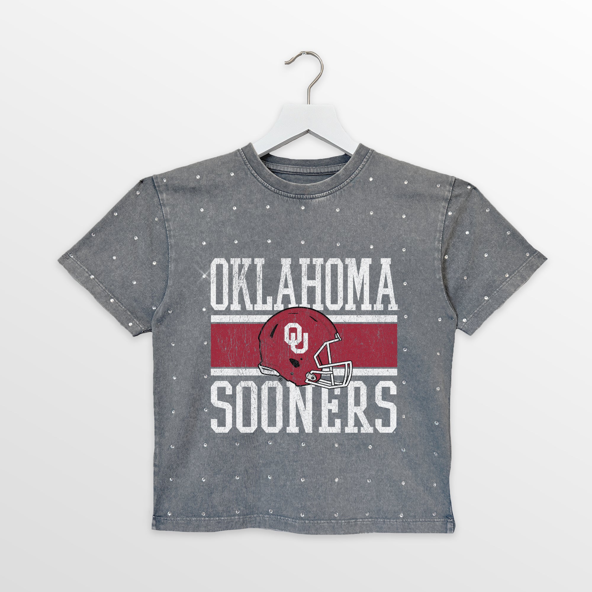 Make a statement in any crowd with our Oklahoma Sooners oversized fit, all-over mini rhinestone short sleeve tee featuring a ribbed neckline. Embrace the sparkle while staying comfortable—perfect for every dedicated fan.