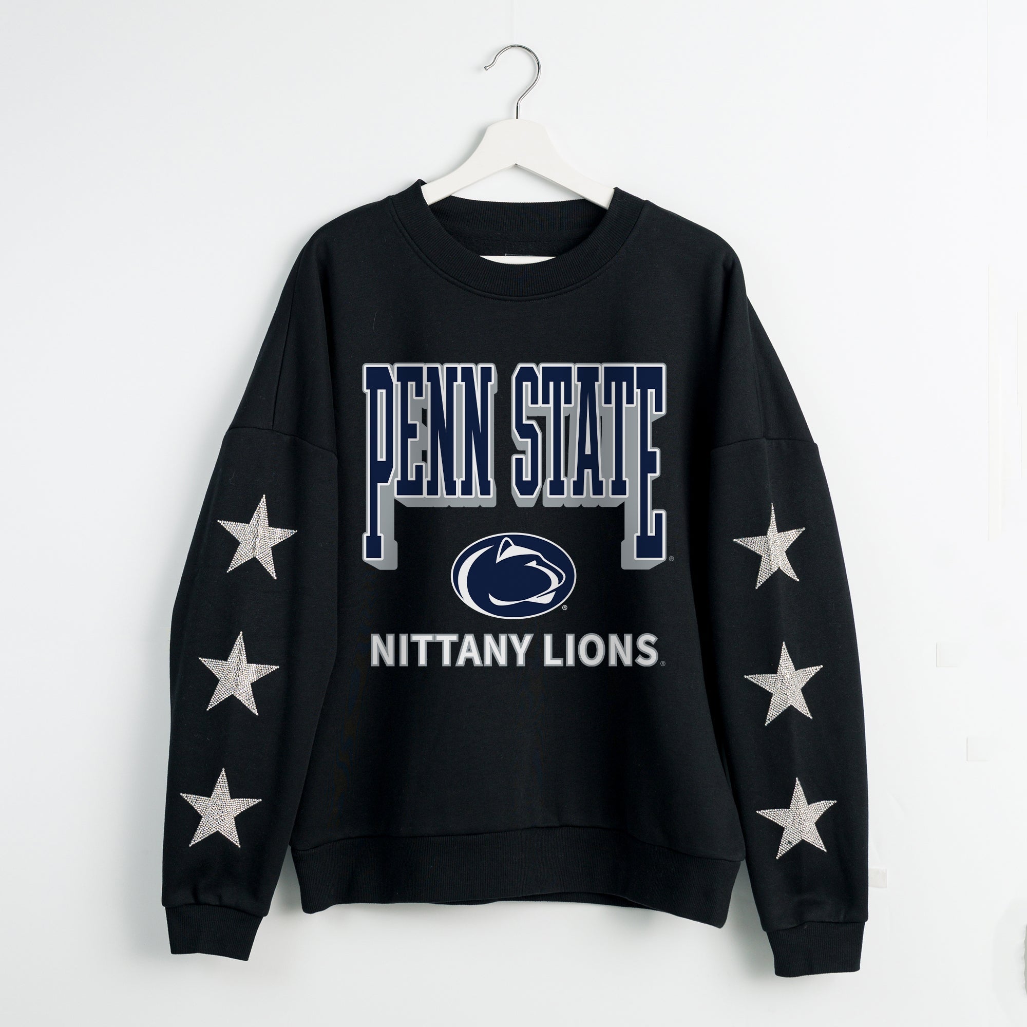 Elevate gameday with our Penn State Nittany Lions drop shoulder, long sleeve fleece pullover adorned with rhinestud stars on the sleeves. Shine brightly and show your Penn State Nittany Lions pride.