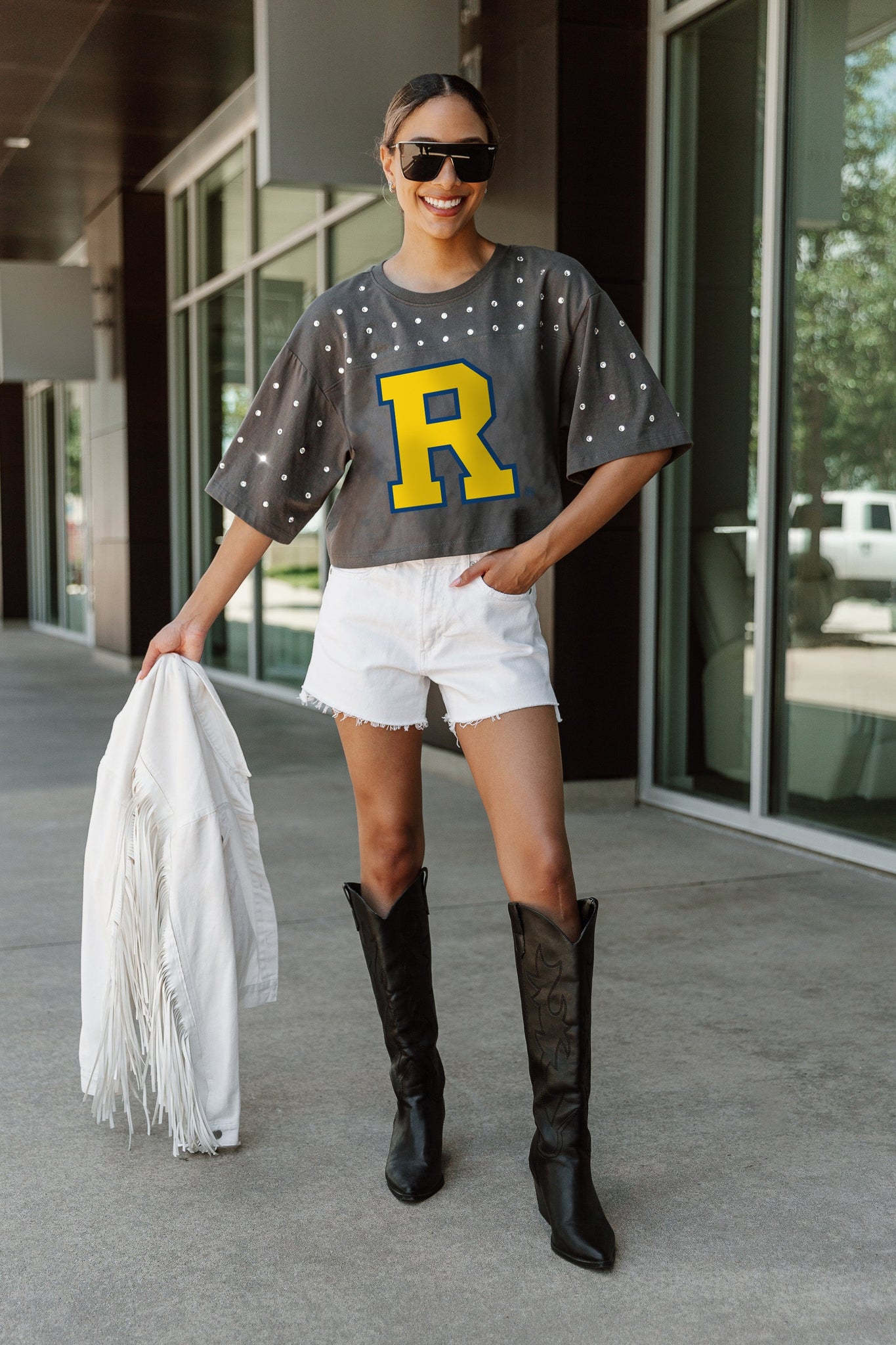Shine with pride in our Rochester Yellowjackets all-over rhinestone cropped tee with yoke. Whether you're cheering from the stands or hitting the town, embrace effortless style and comfort while standing out from the crowd.