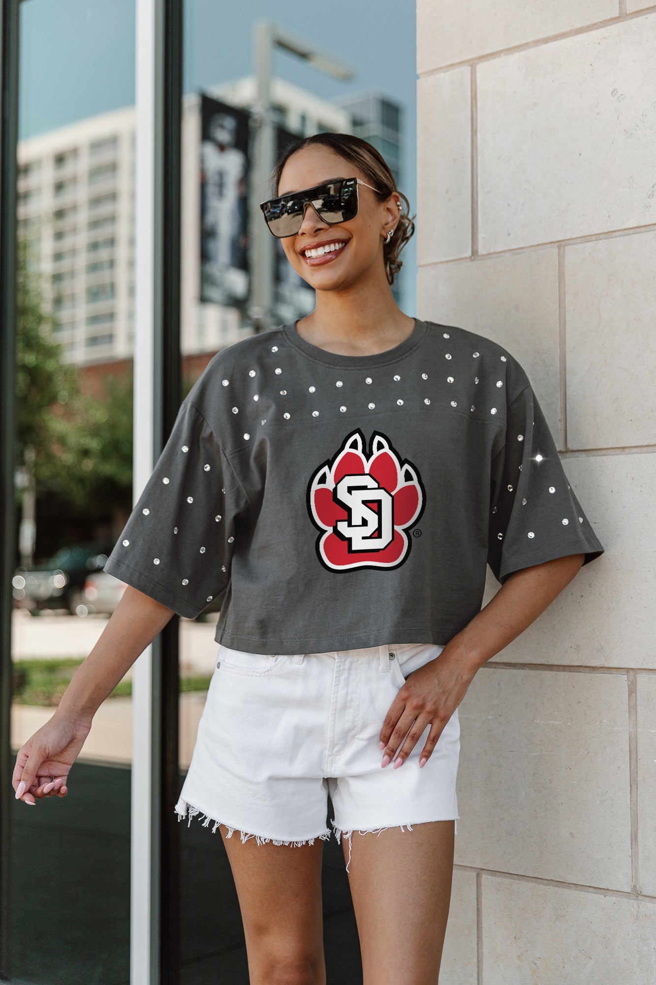 Shine with pride in our South Dakota Coyotes all-over rhinestone cropped tee with yoke. Whether you're cheering from the stands or hitting the town, embrace effortless style and comfort while standing out from the crowd.