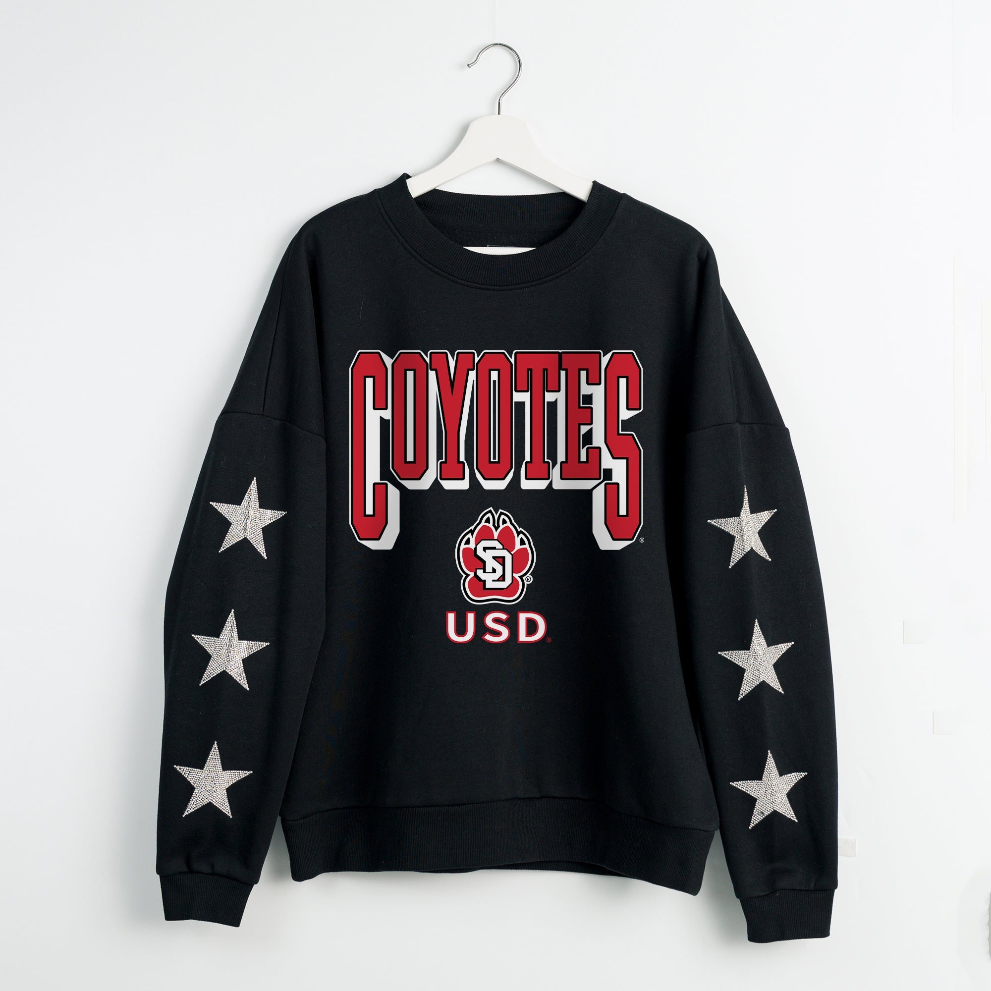 Elevate gameday with our South Dakota Coyotes drop shoulder, long sleeve fleece pullover adorned with rhinestud stars on the sleeves. Shine brightly and show your South Dakota Coyotes pride.