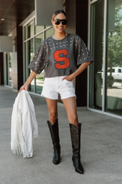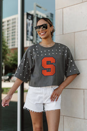 Shine with pride in our Syracuse Orange all-over rhinestone cropped tee with yoke. Whether you're cheering from the stands or hitting the town, embrace effortless style and comfort while standing out from the crowd.