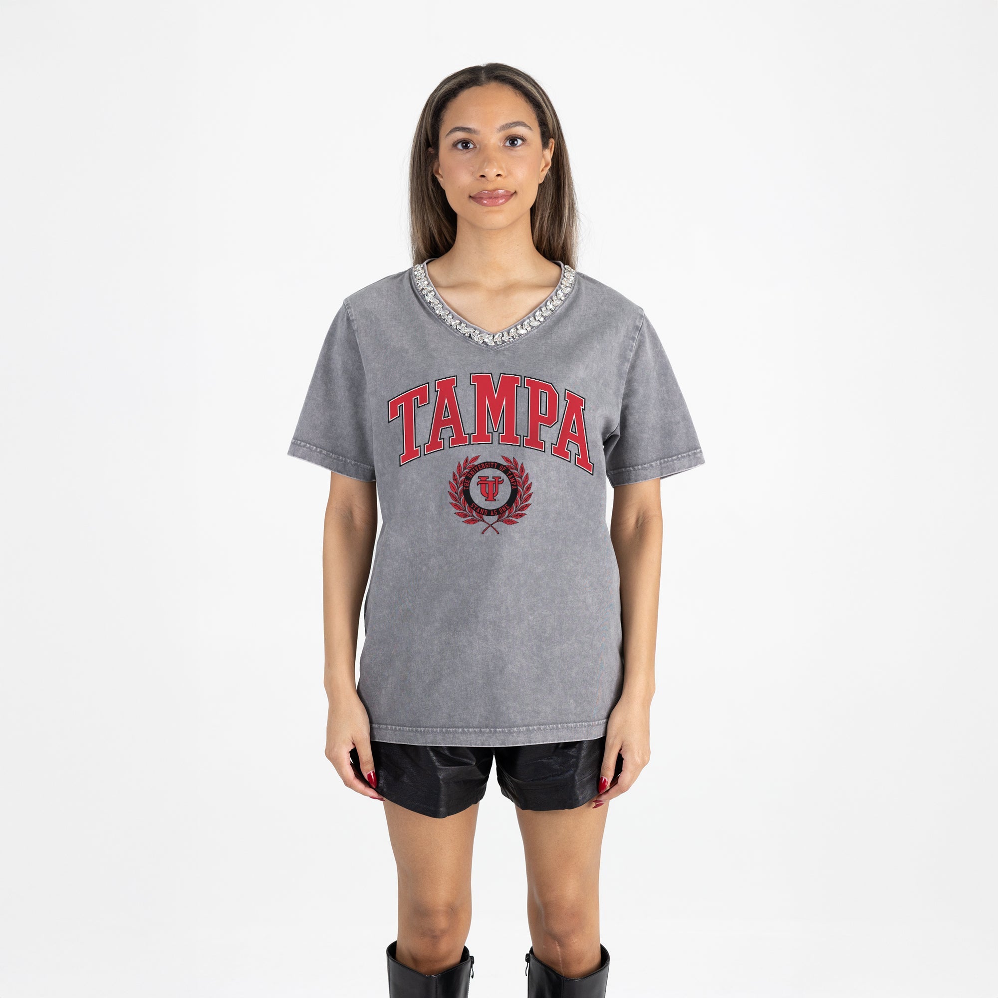 Turn your team spirit into a statement with this rhinestone-trimmed V-neck tee. Made from soft, washed fabric with a relaxed feminine fit, it adds just the right amount of sparkle to your gameday look. Whether you're headed to the tailgate or layering it under a jacket, this tee is bold, easy, and made to shine for Tampa Spartans.
