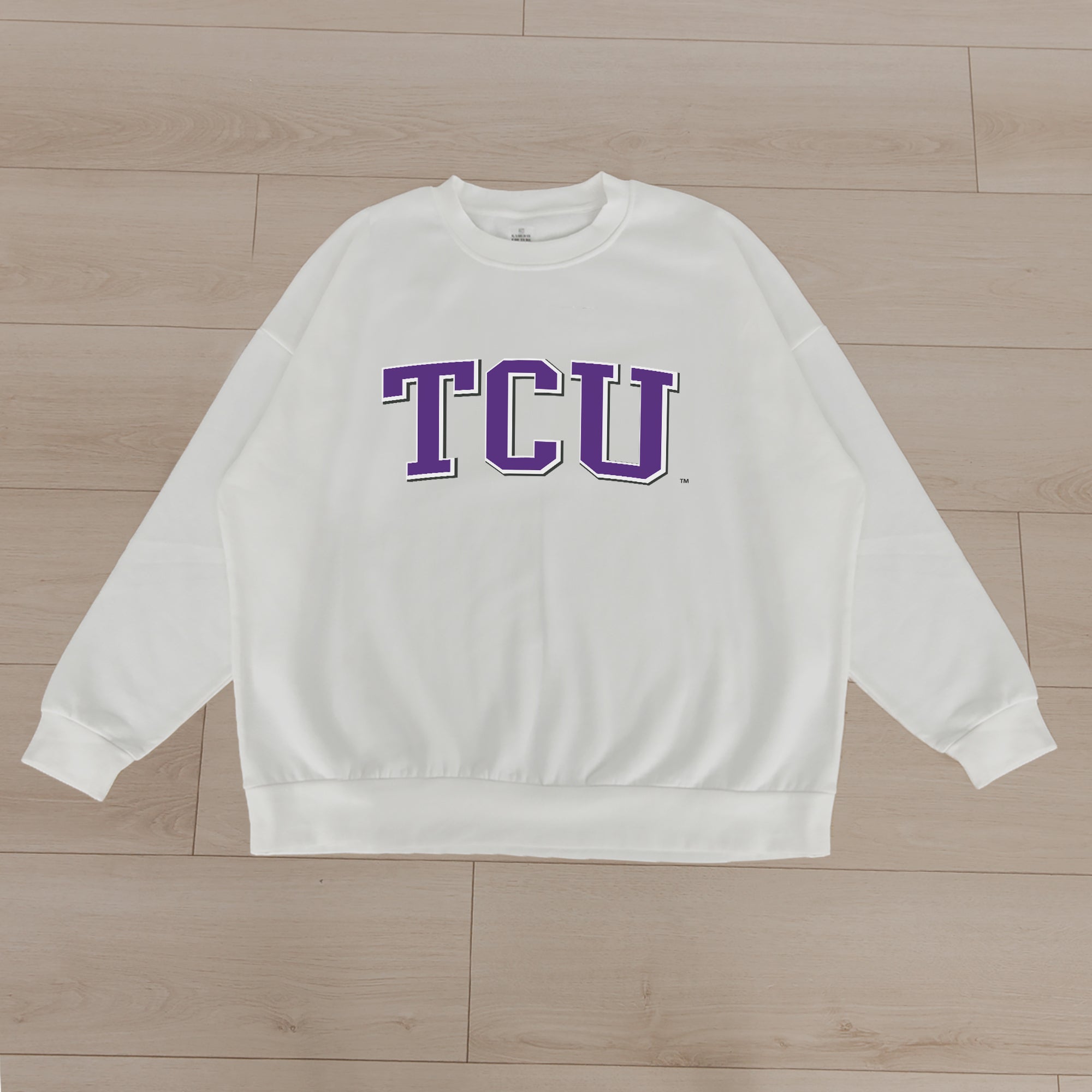 Stand out from the crowd in our Tcu Horned Frogs premium fleece long sleeve sweatshirt. Boasting an oversized fit, crewneck and ribbed knit neckline, wrists, and waistband, it effortlessly blends comfort with fashion. Show your support for your favorite school or team in this irresistibly soft sweatshirt.