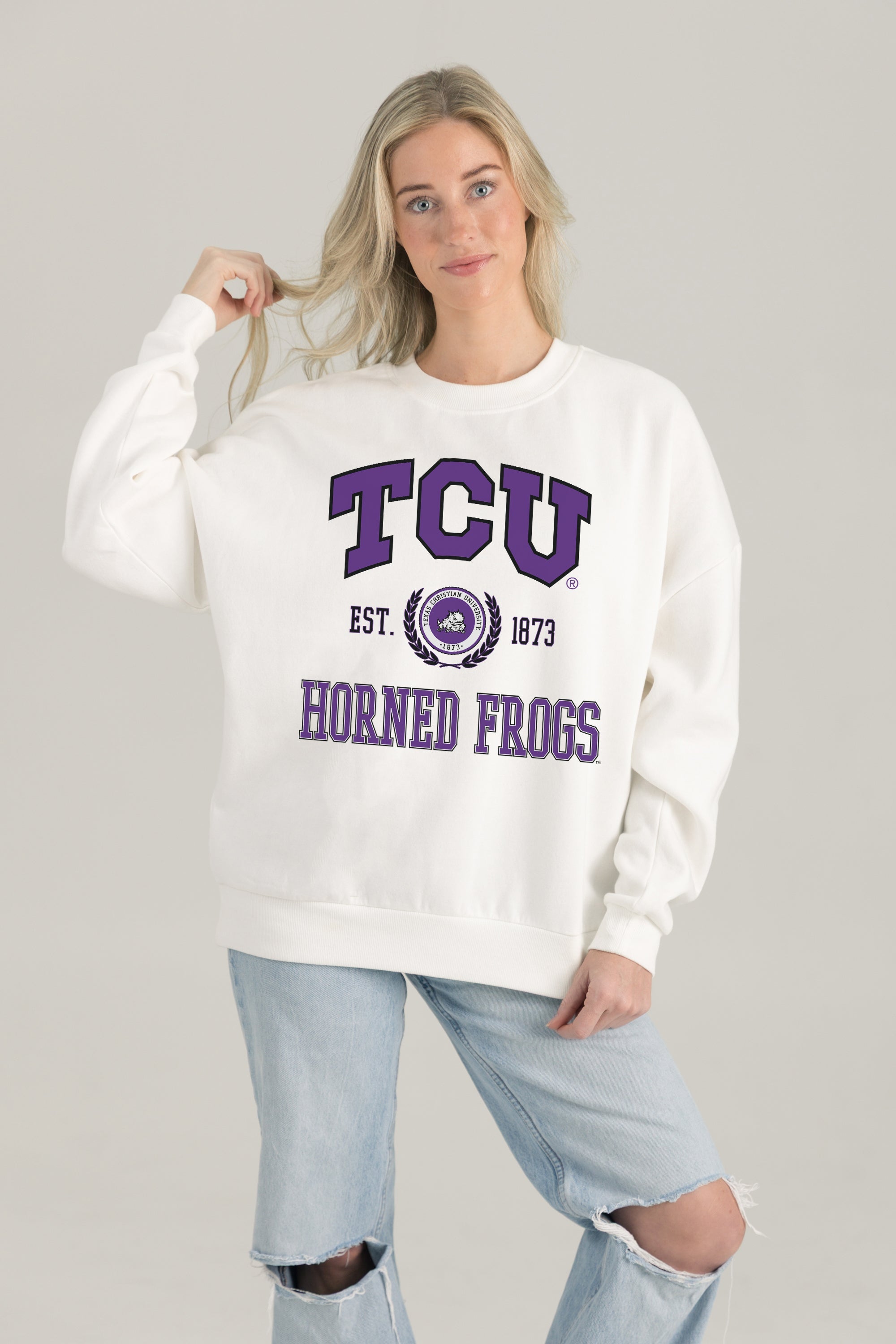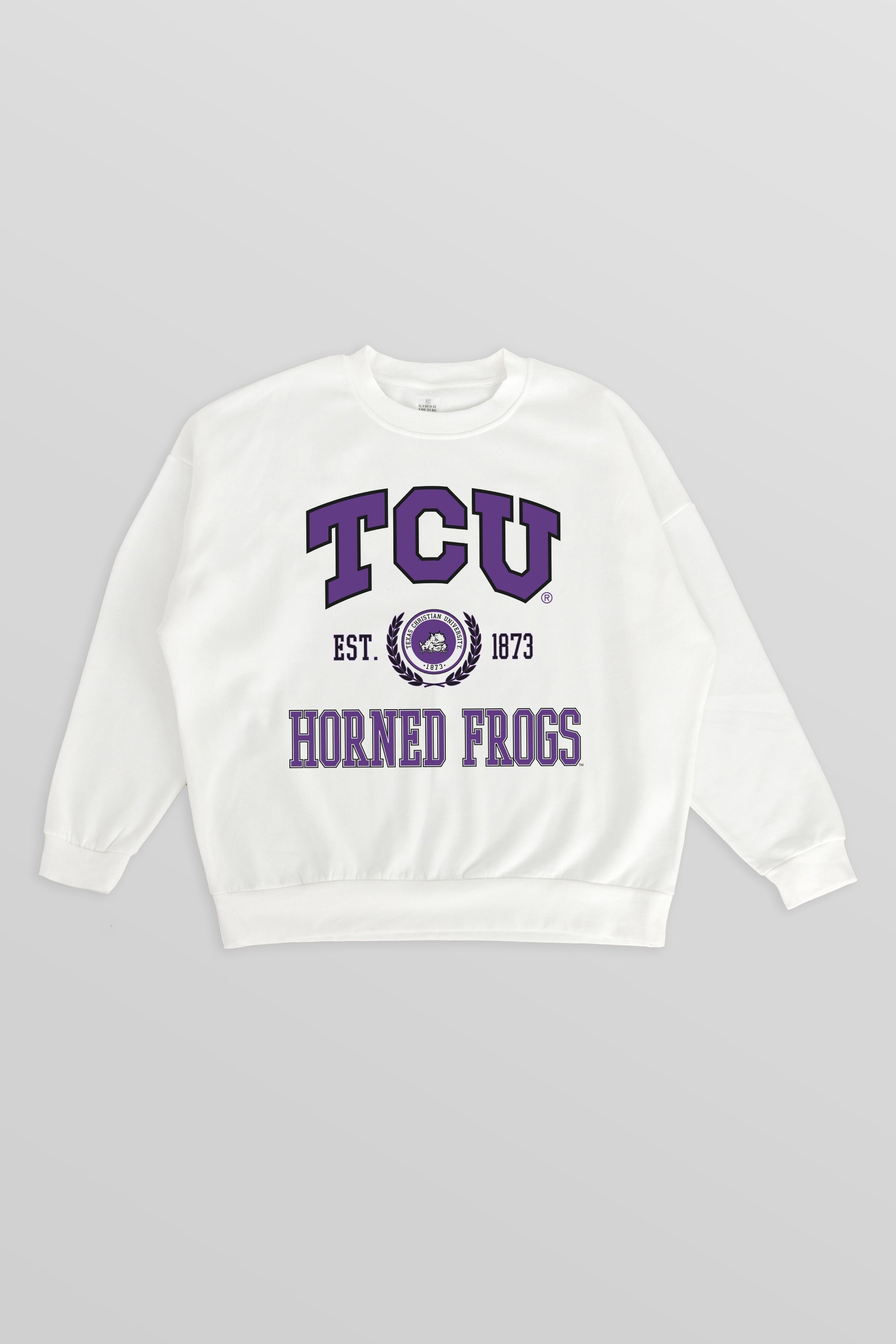 Stand out from the crowd in our Tcu Horned Frogs premium fleece long sleeve sweatshirt. Boasting an oversized fit, crewneck and ribbed knit neckline, wrists, and waistband, it effortlessly blends comfort with fashion. Show your support for your favorite school or team in this irresistibly soft sweatshirt.