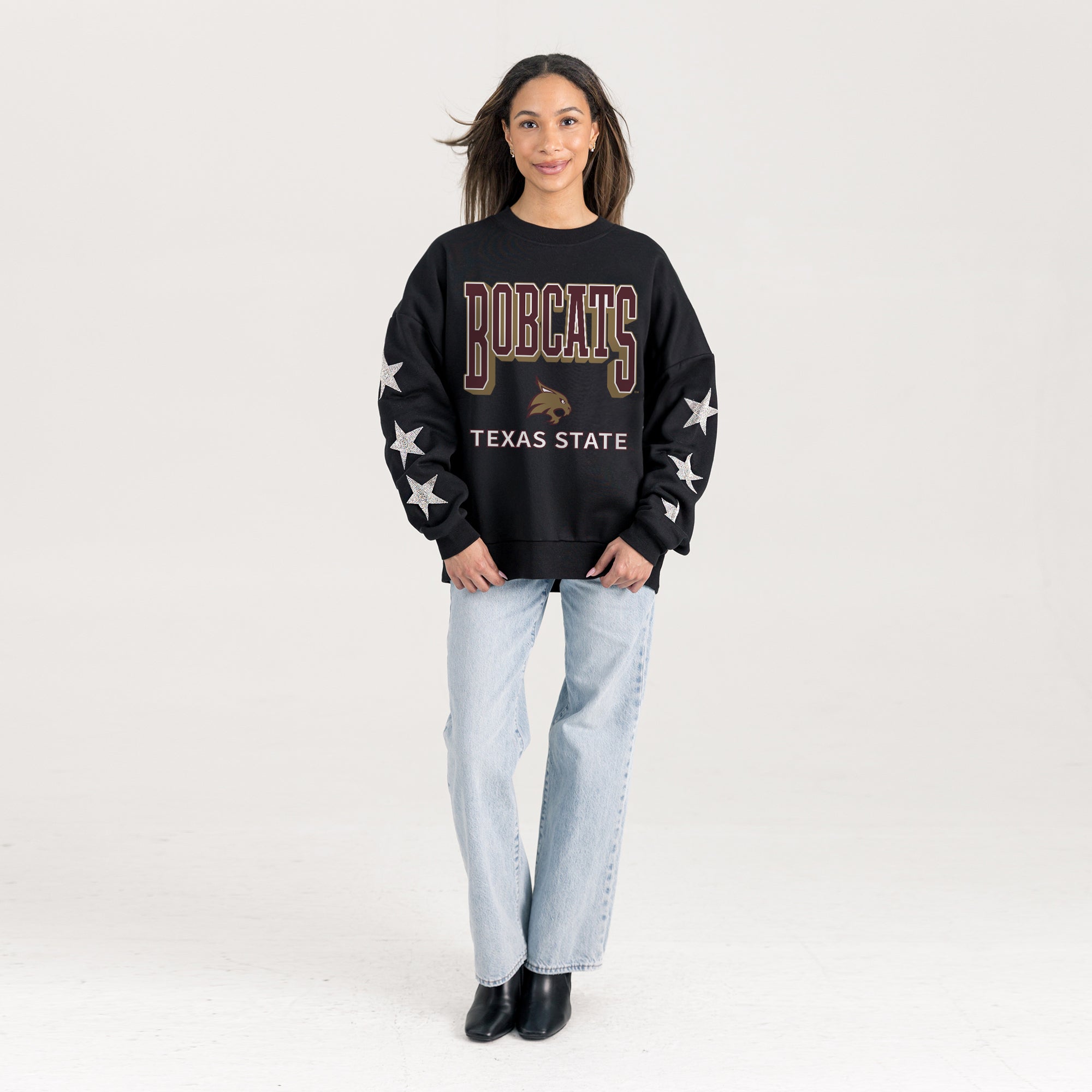 Elevate gameday with our Texas State Bobcats drop shoulder, long sleeve fleece pullover adorned with rhinestud stars on the sleeves. Shine brightly and show your Texas State Bobcats pride.