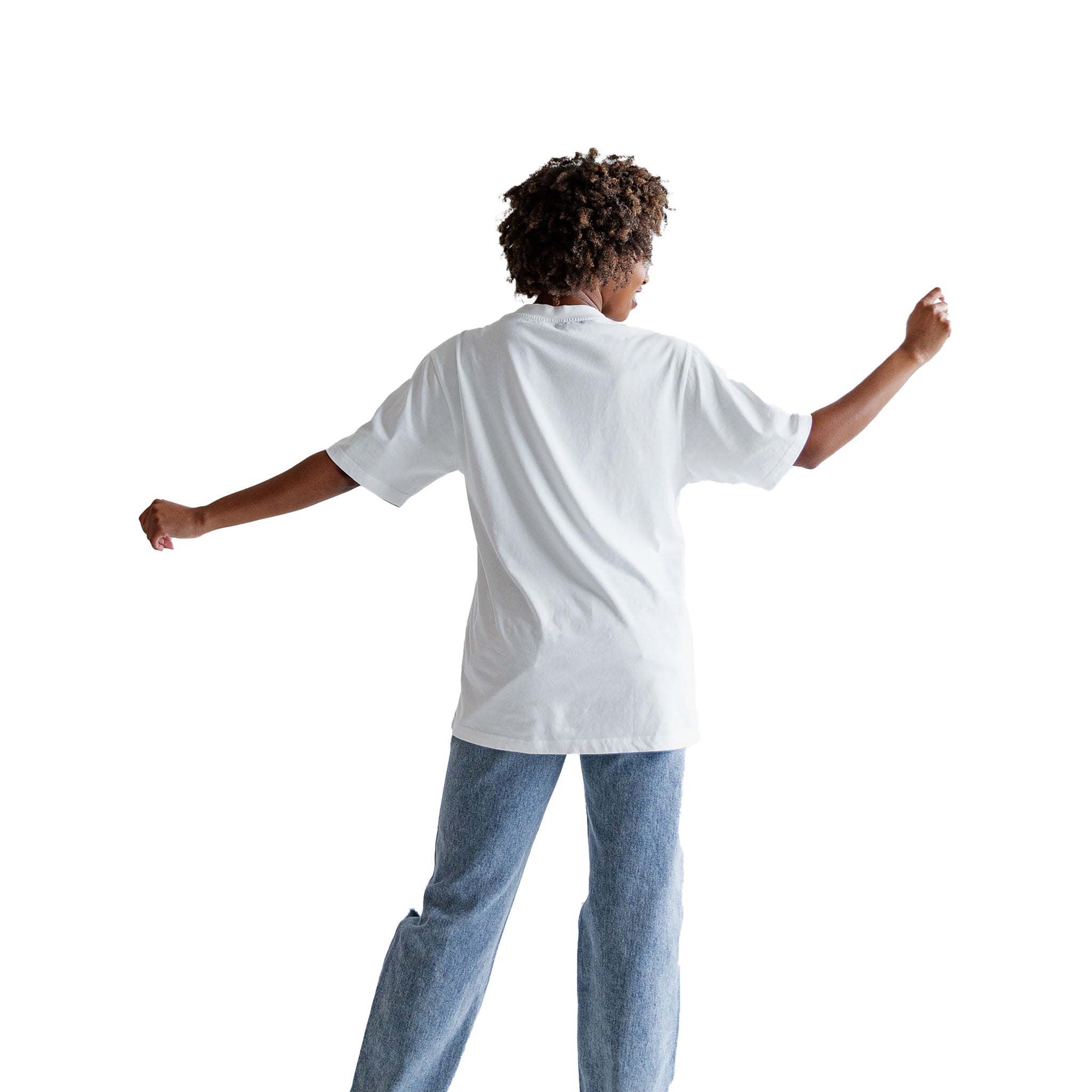 The oversized crewneck tee is made from 100% cotton. To ensure its longevity, we recommend washing it inside out in cold water with similar colors. Tumble dry on low or hang dry to prevent shrinkage. Do not bleach, iron, or dry clean.