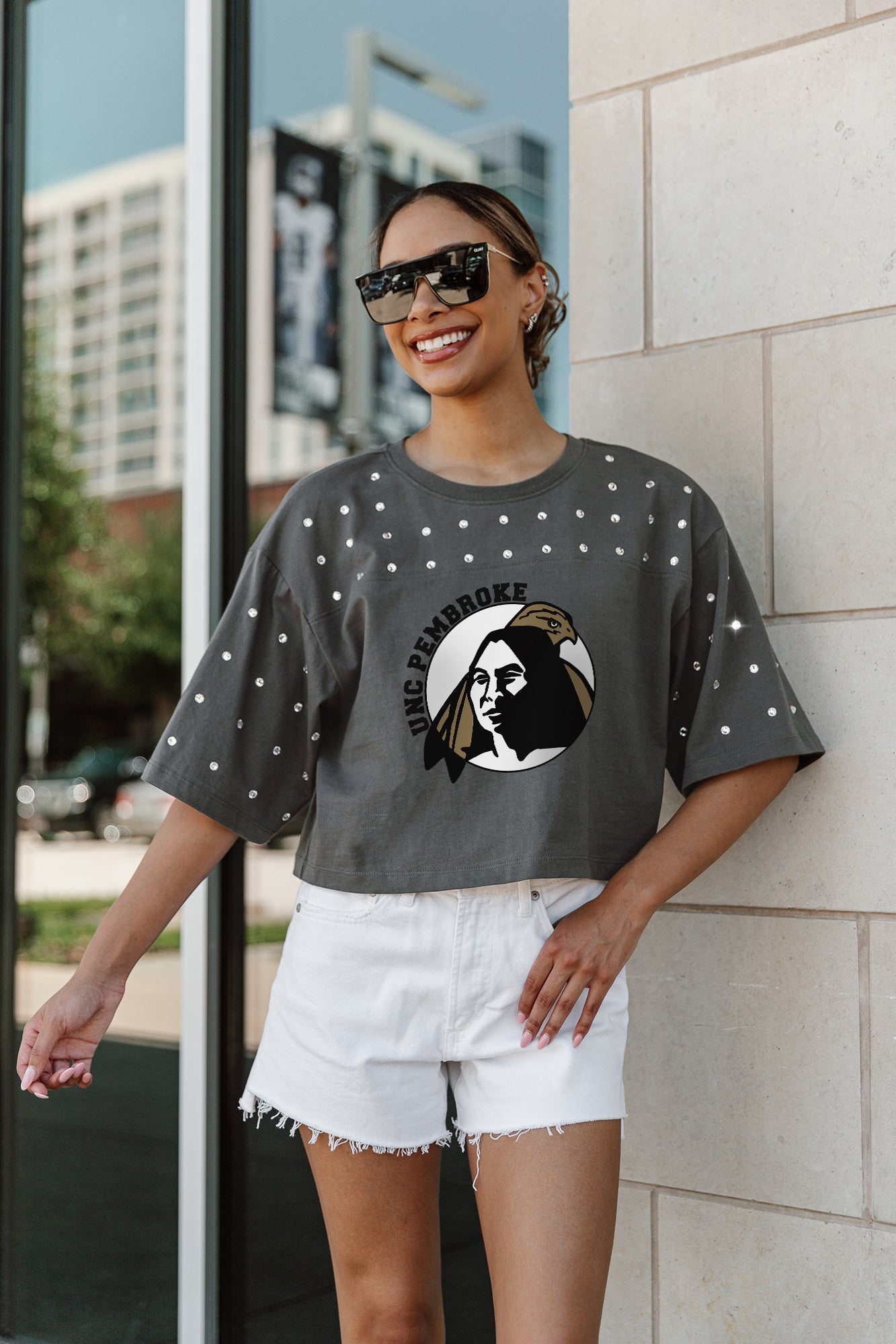 Shine with pride in our Unc At Pembroke Braves all-over rhinestone cropped tee with yoke. Whether you're cheering from the stands or hitting the town, embrace effortless style and comfort while standing out from the crowd.