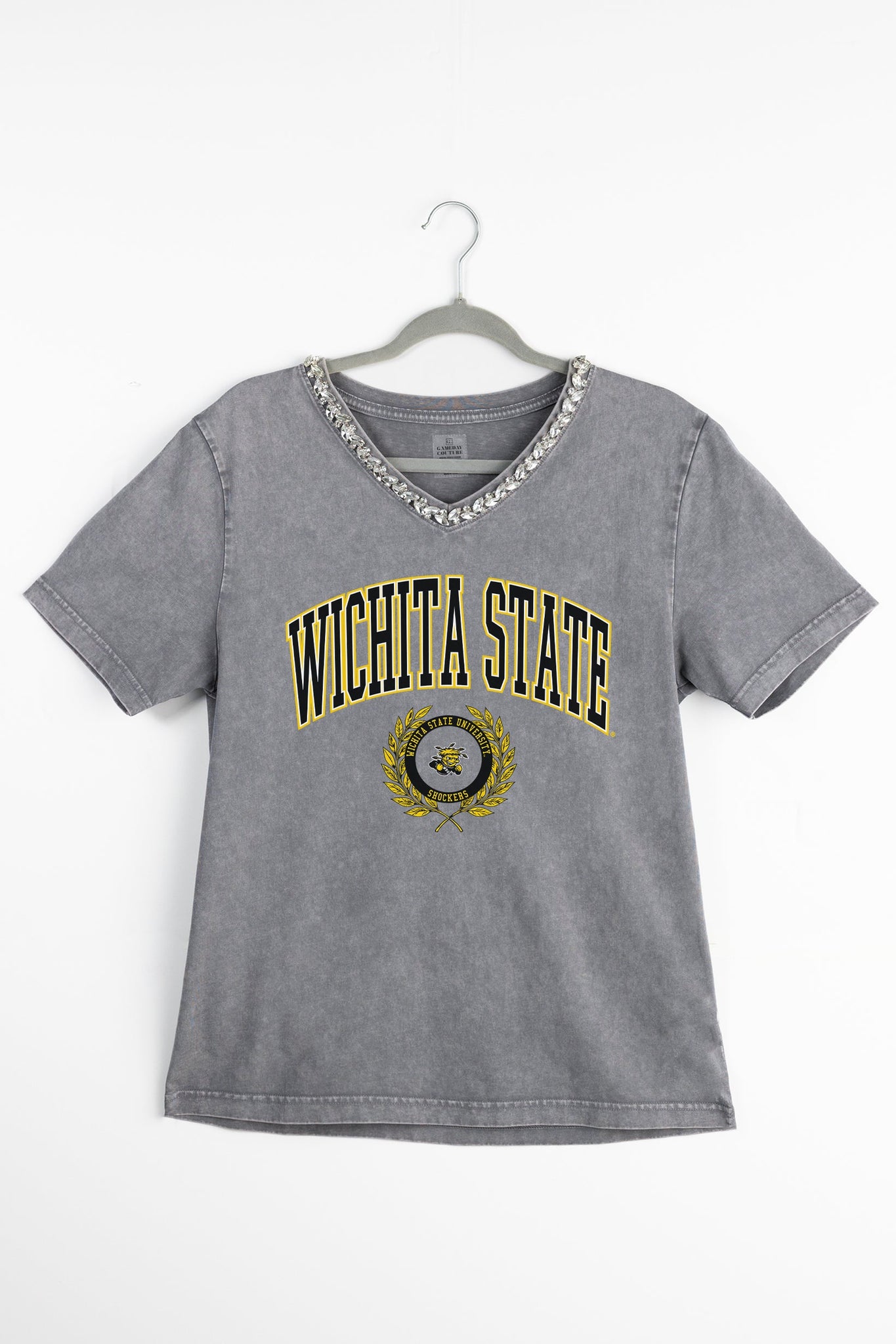 Turn your team spirit into a statement with this rhinestone-trimmed V-neck tee. Made from soft, washed fabric with a relaxed feminine fit, it adds just the right amount of sparkle to your gameday look. Whether you're headed to the tailgate or layering it under a jacket, this tee is bold, easy, and made to shine for Wichita State Shockers.