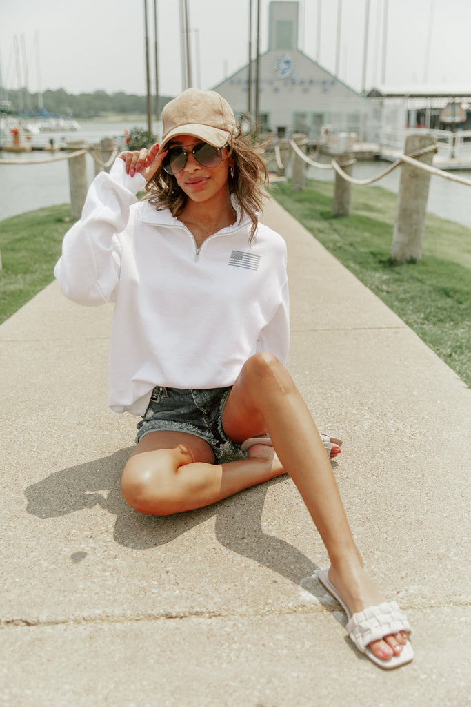 The "Glory" vintage classic crewneck sweatshirt is featured in a relaxed fit pullover design! Crafted in a lightweight fabrication and pre-shrunk blend makes this pullover perfect for any occasion. Featuring a quarter zip up, long sleeves and ribbed edges, this piece is both effortless and comfortable.