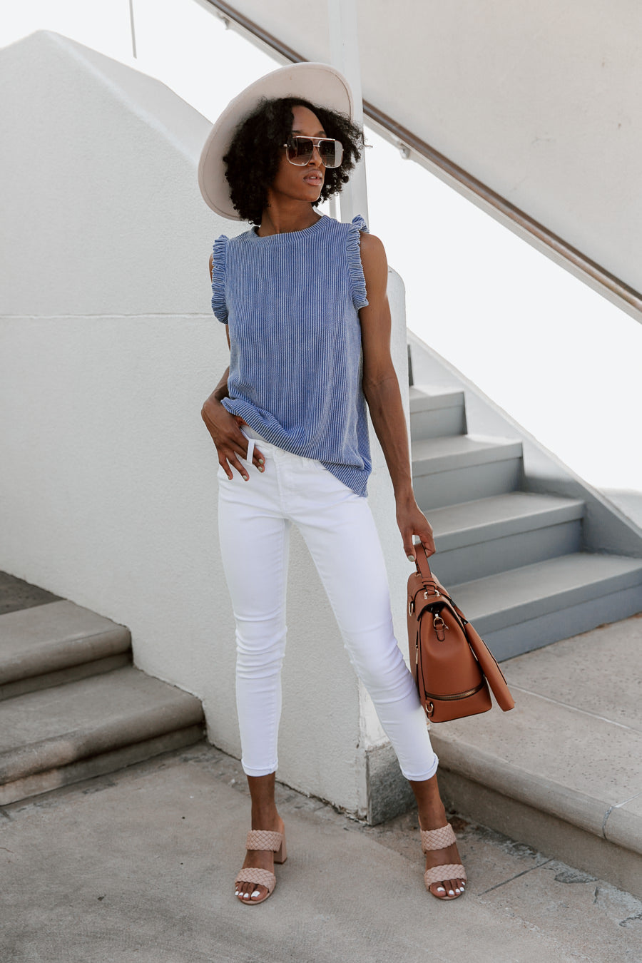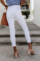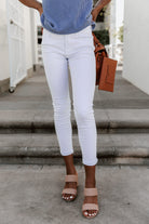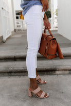 Now is the time to stock up on your white denim! Our "Jane" white skinny comes in a mid rise style in a stretchy fabric. Finished with a classic 5 pocket and a front fly zipper and button closure. Styled with the "Paily" ribbed ruffle tank and the "Teigan" braided sandals.