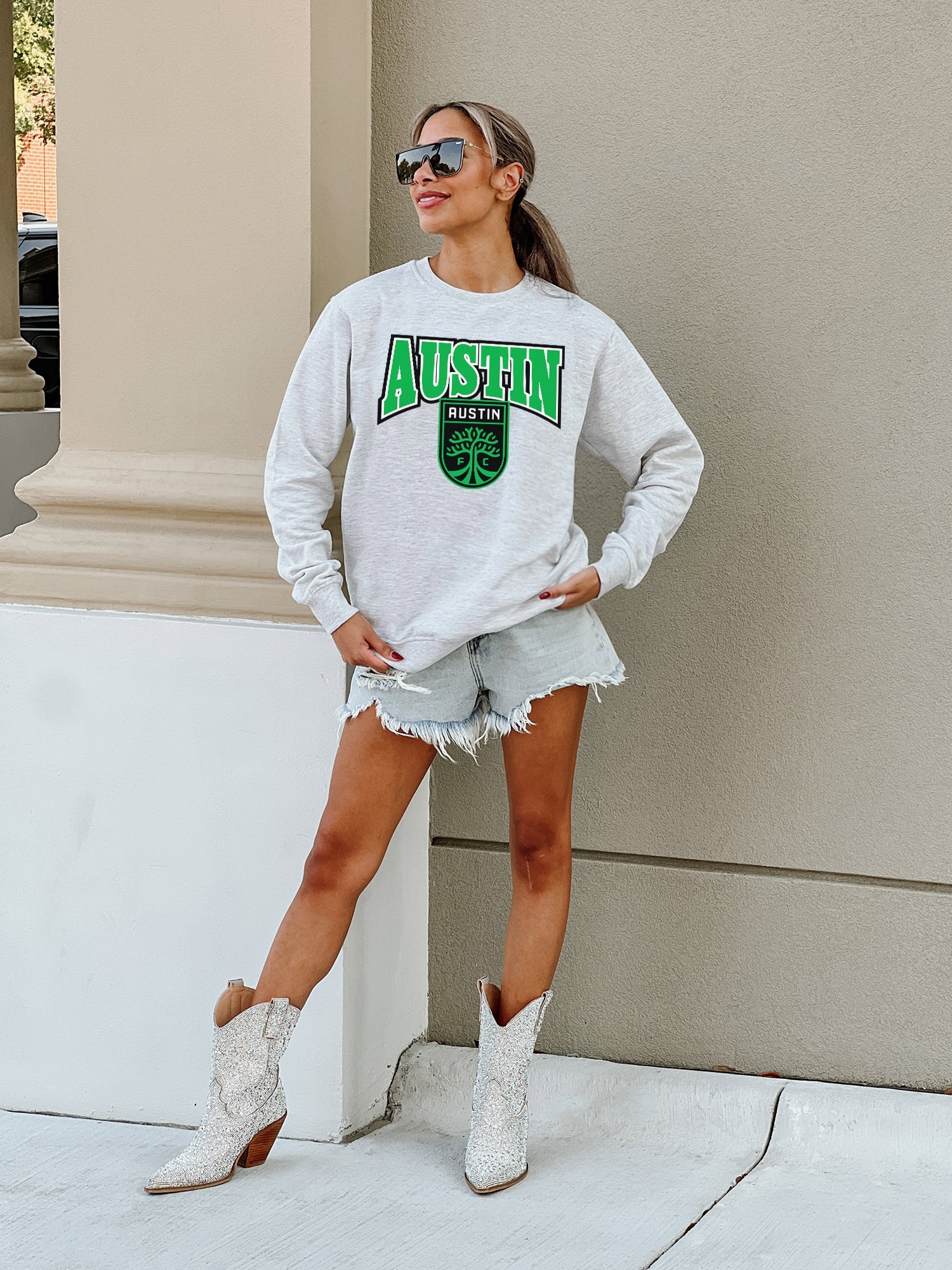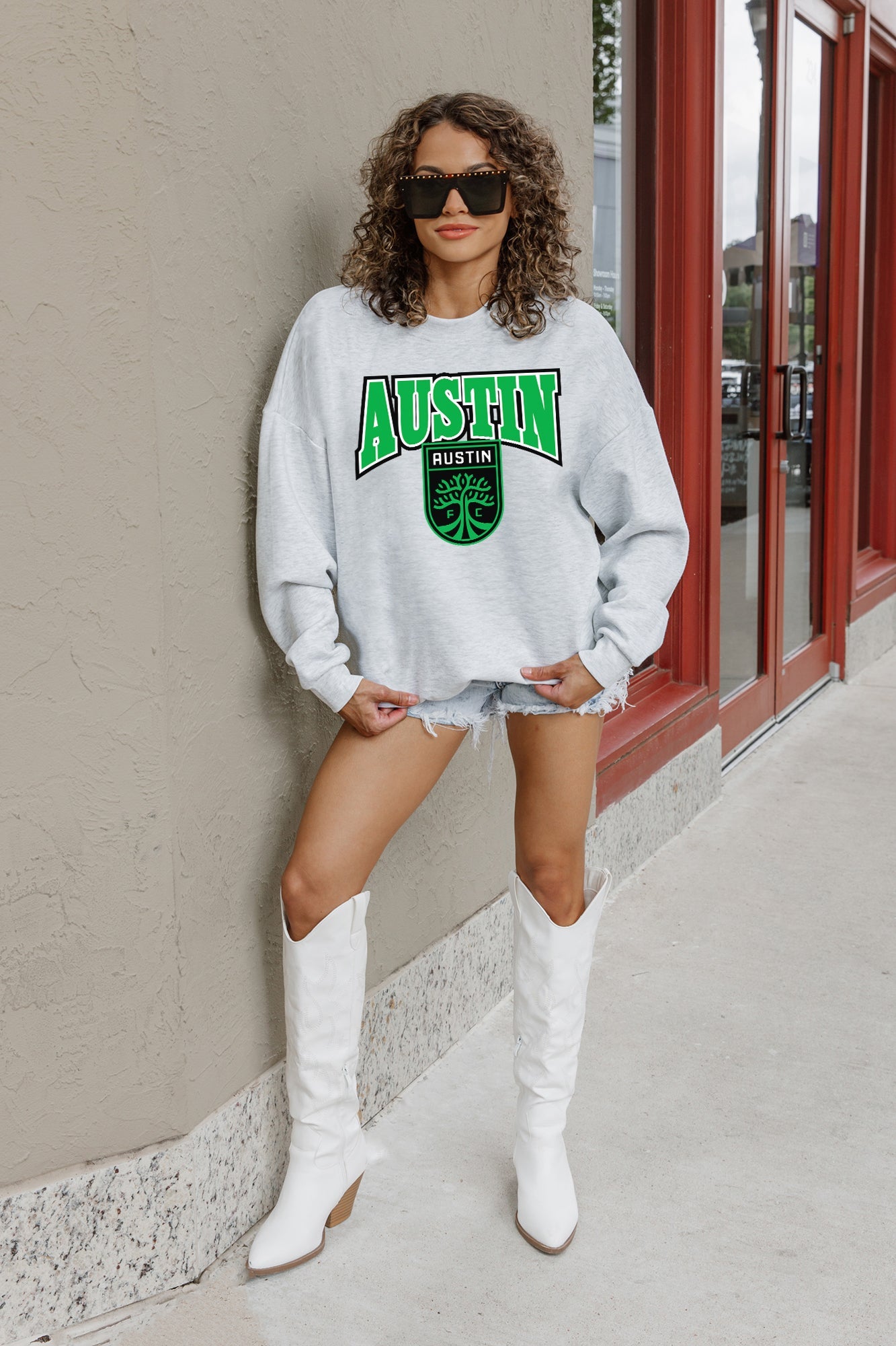 Stand out from the crowd in our Austin Fc premium fleece long sleeve sweatshirt. Boasting an oversized fit, crewneck and ribbed knit neckline, wrists, and waistband, it effortlessly blends comfort with fashion. Show your support for your favorite school or team in this irresistibly soft sweatshirt.